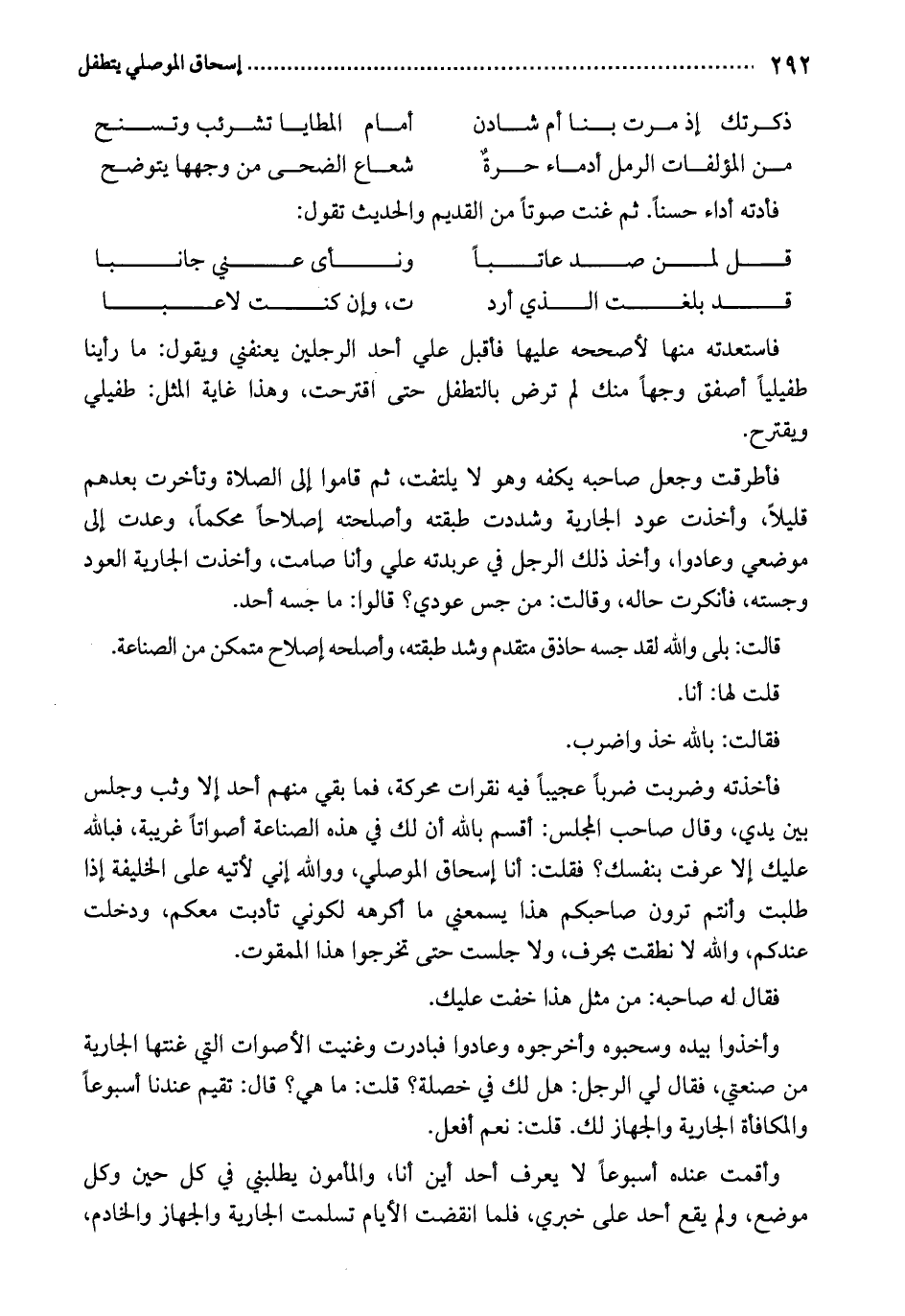 فأطرقت وجعل صاحبه يكفه وهو لا يلتفت، ثم قاموا إلى الصلاة وتأخرت بعدهم قليلاً، وأخذت عود الجارية وشددت طبقته وأصلحته إصلاحاً محكماً، وعدت إلى موضعي وعادوا، وأخذ ذلك الرجل في عربدته علي وأنا صامت، وأخذت الجارية العود وجسته، فأنكرت حاله، وقالت: من جس عودي؟ قالوا: ما جسه أحد.