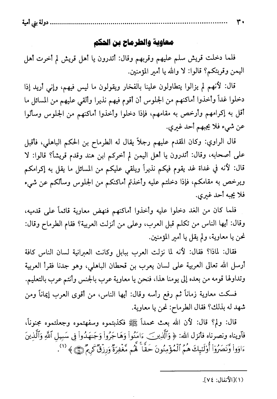 فلما كان من الغد دخلوا عليه وأخذوا أماكنهم فنهض معاوية قائماً على قدميه، وقال: أيها الناس من تكلم قبل العرب، وعلى من أنزلت العربية؟ فقام الطرماح وقال: نحن يا معاوية، ولم يقل يا أمير المؤمنين.