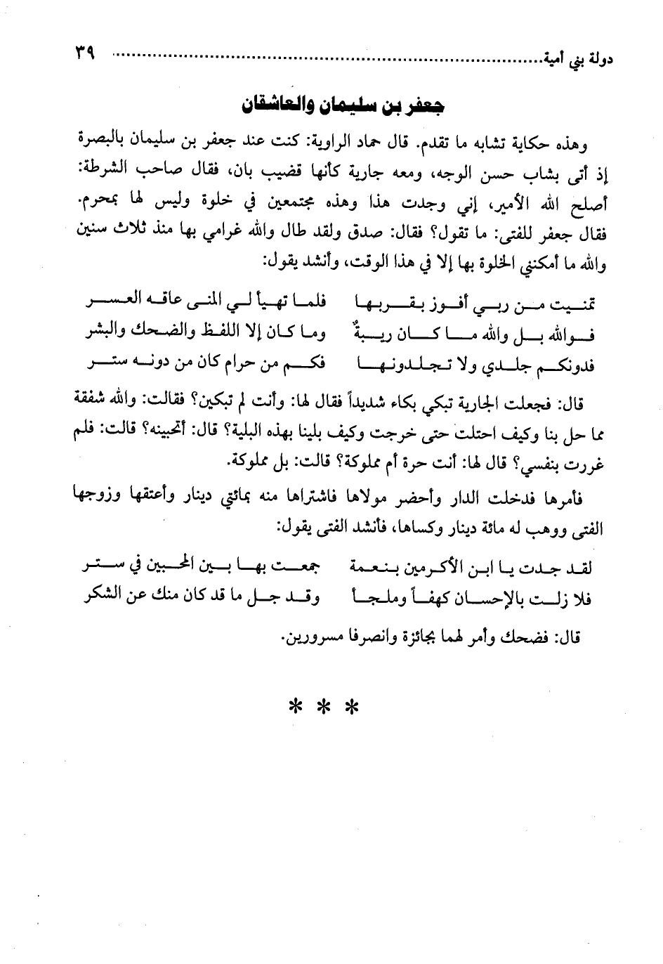 وهذه حكاية تشابه ما تقدم. قال حماد الراوية: كنت عند جعفر بن سليمان بالبصرة إذ أتى بشاب حسن الوجه، ومعه جارية كأنها قضيب بان، فقال صاحب الشرطة: أصلح الله الأمير، إني وجدت هذا وهذه مجتمعين في خلوة وليس لها بمحرم.