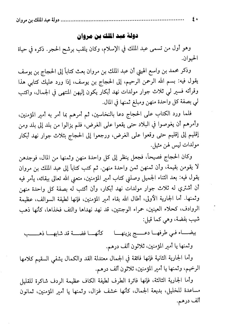 وذكر محمد بن واسع الهيتي أن عبد الملك بن مروان بعث كتاباً إلى الحجاج بن يوسف يقول فيه: بسم الله الرحمن الرحيم، إلى الحجاج بن يوسف، إذا ورد عليك كتابي هذا وقرأته فسير لي ثلاث جوار مولدات نهد أبكار يكون إليهن المنتهى في الجمال، واكتب لي بصفة كل واحدة منهن ومبلغ ثمنها في المال.