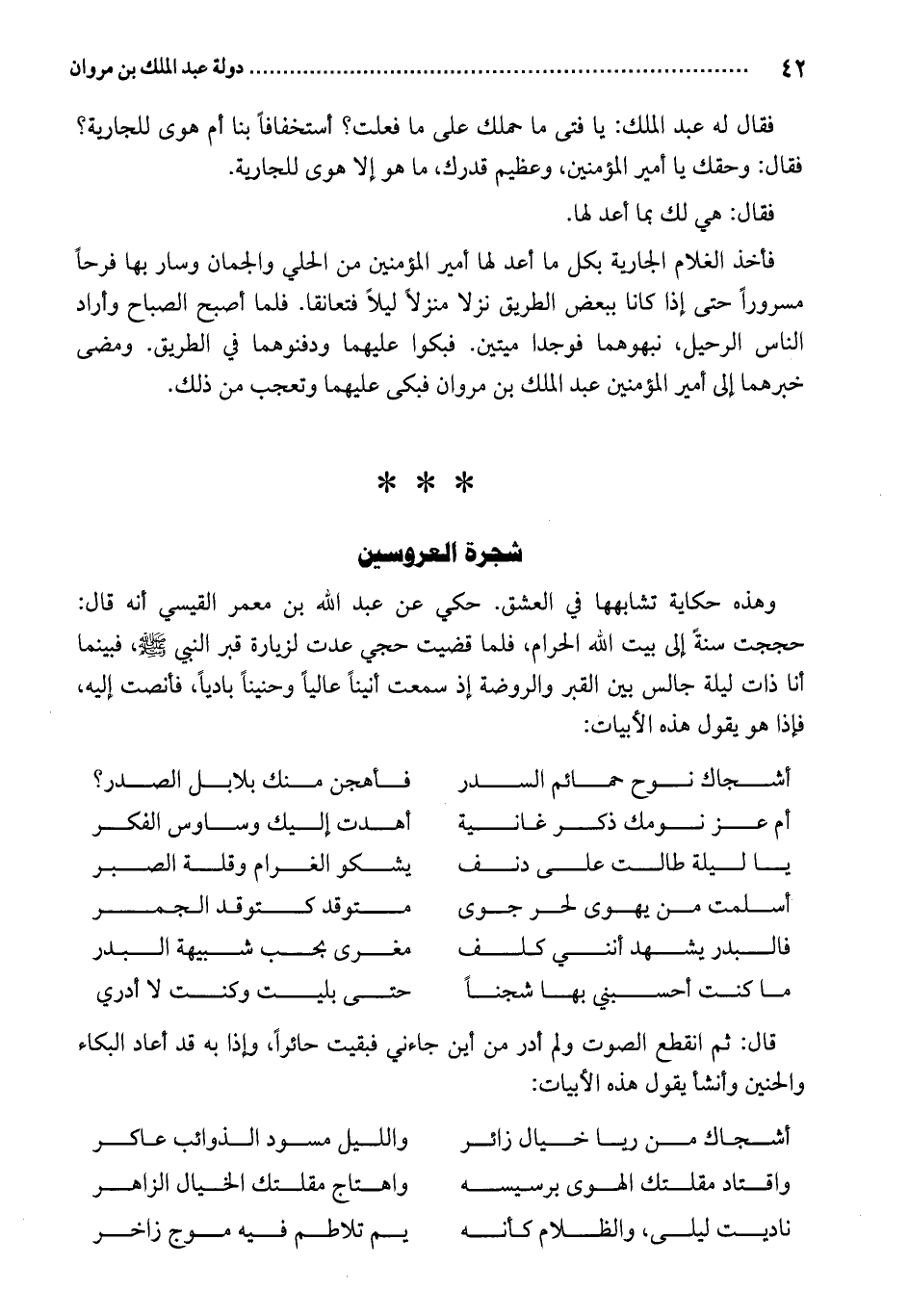 فأخذ الغلام الجارية بكل ما أعد لها أمير المؤمنين من الحلي والجمان وسار بها فرحاً مسروراً حتى إذا كانا ببعض الطريق نزلا منزلاً ليلاً فتعانقا. فلما أصبح الصباح وأراد الناس الرحيل، نبهوهما فوجدا ميتين. فبكوا عليهما ودفنوهما في الطريق. ومضى خبرهما إلى أمير المؤمنين عبد الملك بن مروان فبكى عليهما وتعجب من ذلك.