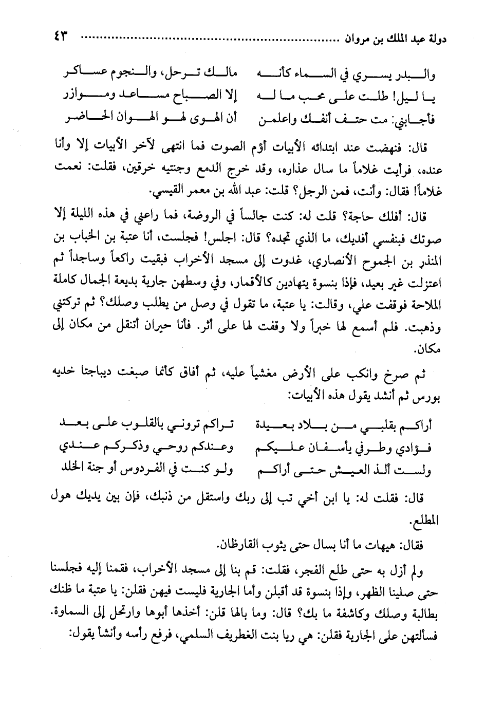 قال: أفلك حاجة؟ قلت له: كنت جالساً في الروضة، فما راعني في هذه الليلة إلا صوتك فبنفسي أفديك، ما الذي تجده؟ قال: اجلس! فجلست، أنا عتبة بن الخباب بن المنذر بن الجموح الأنصاري، غدوت إلى مسجد الأخراب فبقيت راكعاً وساجداً ثم اعتزلت غير بعيد، فإذا بنسوة يتهادين كالأقمار، وفي وسطهن جارية بديعة الجمال كاملة الملاحة فوقفت علي، وقالت: يا عتبة، ما تقول في وصل من يطلب وصلك؟ ثم تركتني وذهبت. فلم أسمع لها خبراً ولا وقفت لها على أثر. فأنا حيران أتنقل من مكان إلى مكان.