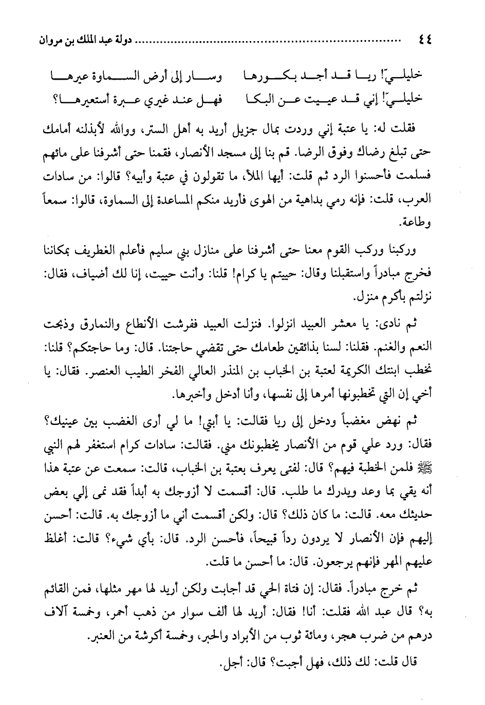 ثم نادى: يا معشر العبيد انزلوا. فنزلت العبيد ففرشت الأنطاع والنمارق وذبحت النعم والغنم. فقلنا: لسنا بذائقين طعامك حتى تقضي حاجتنا. قال: وما حاجتكم؟ قلنا: نخطب ابنتك الكريمة لعتبة بن الخباب بن المنذر العالي الفخر الطيب العنصر. فقال: يا أخي إن التي تخطبونها أمرها إلى نفسها، وأنا أدخل وأخبرها.