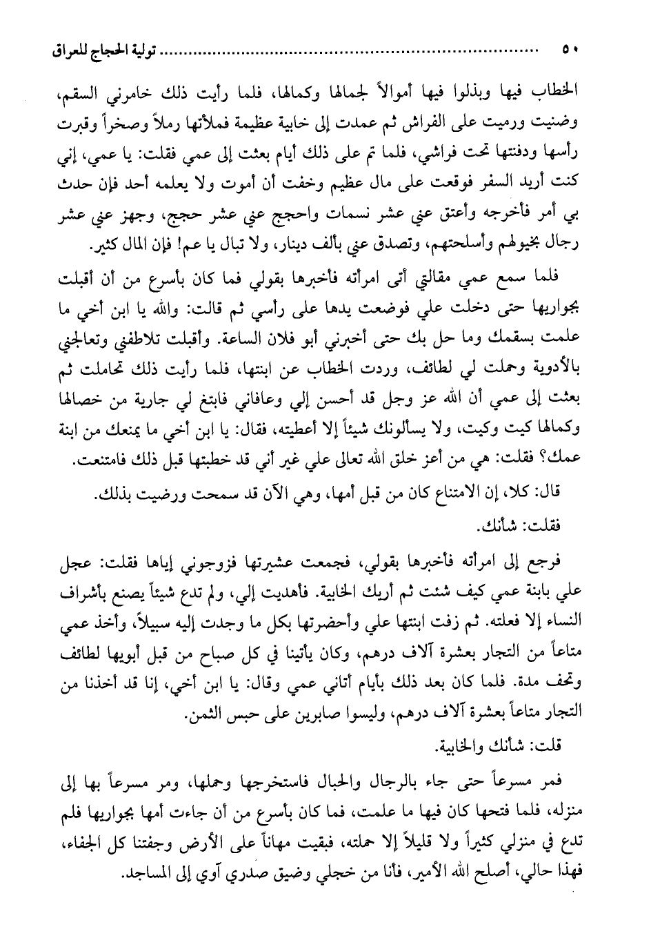 فلما سمع عمي مقالتي أتى امرأته فأخبرها بقولي فما كان بأسرع من أن أقبلت بجواريها حتى دخلت علي فوضعت يدها على رأسي ثم قالت: والله يا ابن أخي ما علمت بسقمك وما حل بك حتى أخبرني أبو فلان الساعة. وأقبلت تلاطفني وتعالجني بالأدوية وحملت لي لطائف، وردت الخطاب عن ابنتها، فلما رأيت ذلك تحاملت ثم بعثت إلى عمي أن الله عز وجل قد أحسن إلي وعافاني فابتغ لي جارية من خصالها وكمالها كيت وكيت، ولا يسألونك شيئاً إلا أعطيته، فقال: يا ابن أخي ما يمنعك من ابنة عمك؟ فقلت: هي من أعز خلق الله تعالى علي غير أني قد خطبتها قبل ذلك فامتنعت.