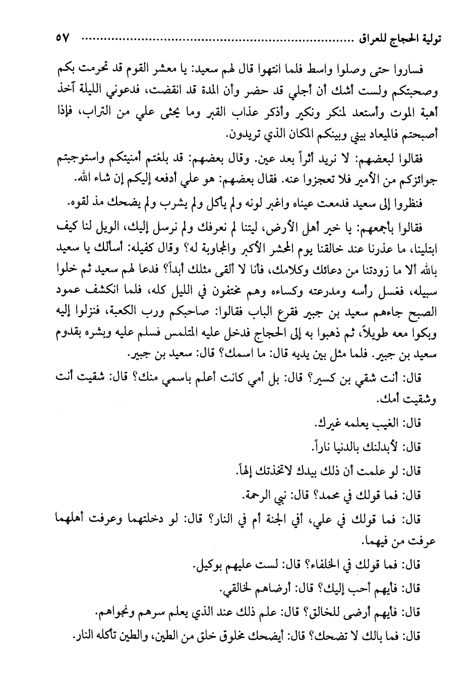 فنظروا إلى سعيد فدمعت عيناه واغبر لونه ولم يأكل ولم يشرب ولم يضحك مذ لقوه. فقالوا بأجمعهم: يا خير أهل الأرض، ليتنا لم نعرفك ولم نرسل إليك الويل لنا كيف ابتلينا، ما عذرنا عند خالقنا يوم المحشر الأكبر والمجاوبة له؟ وقال كفيله: أسألك يا سعيد بالله ألا ما زودتنا من دعائك وكلامك، فأنا لا ألقى مثلك أبداً؟ فدعا لهم سعيد ثم خلو سبيله، فغسل رأسه ومدرعته وكساءه وهم مختفون في الليل كله، فلما انكشف عمود الصبح جاءهم سعيد ابن جبير فقرع الباب فقالوا: صاحبكم ورب الكعبة، فنزلوا إليه وبكوا معه طويلاً، ثم ذهبوا به إلى الحجاج فدخل عليه المتلمس فسلم عليه وبشره بقدوم سعيد بن جبير. فلما مثل بين يديه قال: ما اسمك؟ قال: سعيد بن جبير.