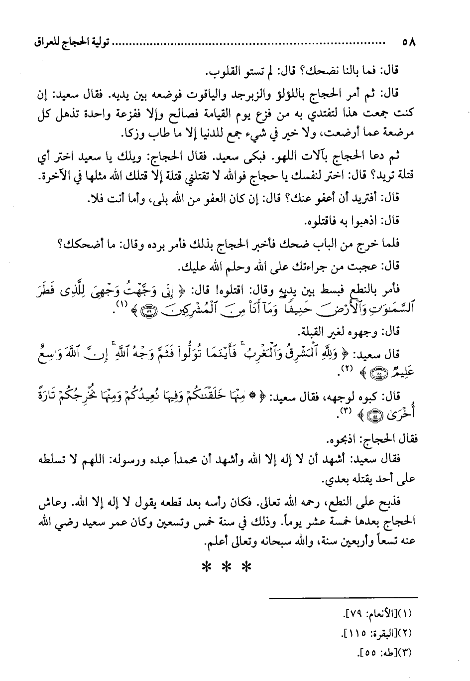 ثم دعا الحجاج بآلات اللهو. فبكى سعيد. فقال الحجاج: ويلك يا سعيد اختر أي قتلة تريد؟ قال: اختر لنفسك يا حجاج فوالله لا تقتلني قتلة إلا قتلك الله مثلها في الآخرة.