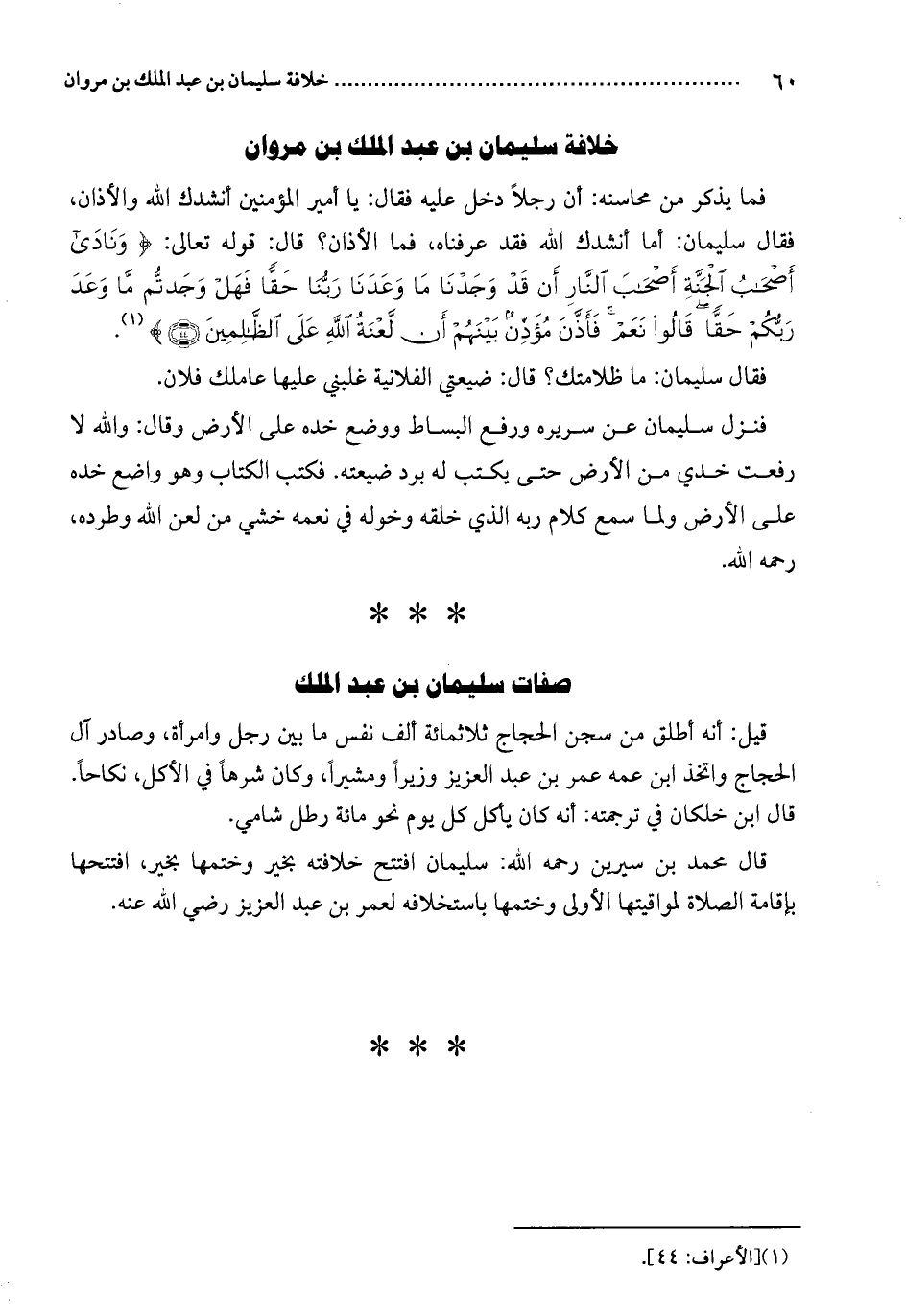 فما يذكر من محاسنه: أن رجلاً دخل عليه فقال: يا أمير المؤمنين أنشدك الله والأذان، فقال سليمان: أما أنشدك الله فقد عرفناه، فما الأذان؟ قال: قوله تعالى: " فأذن مؤذن بينهم: أن لعنة الله على الظالمين ".