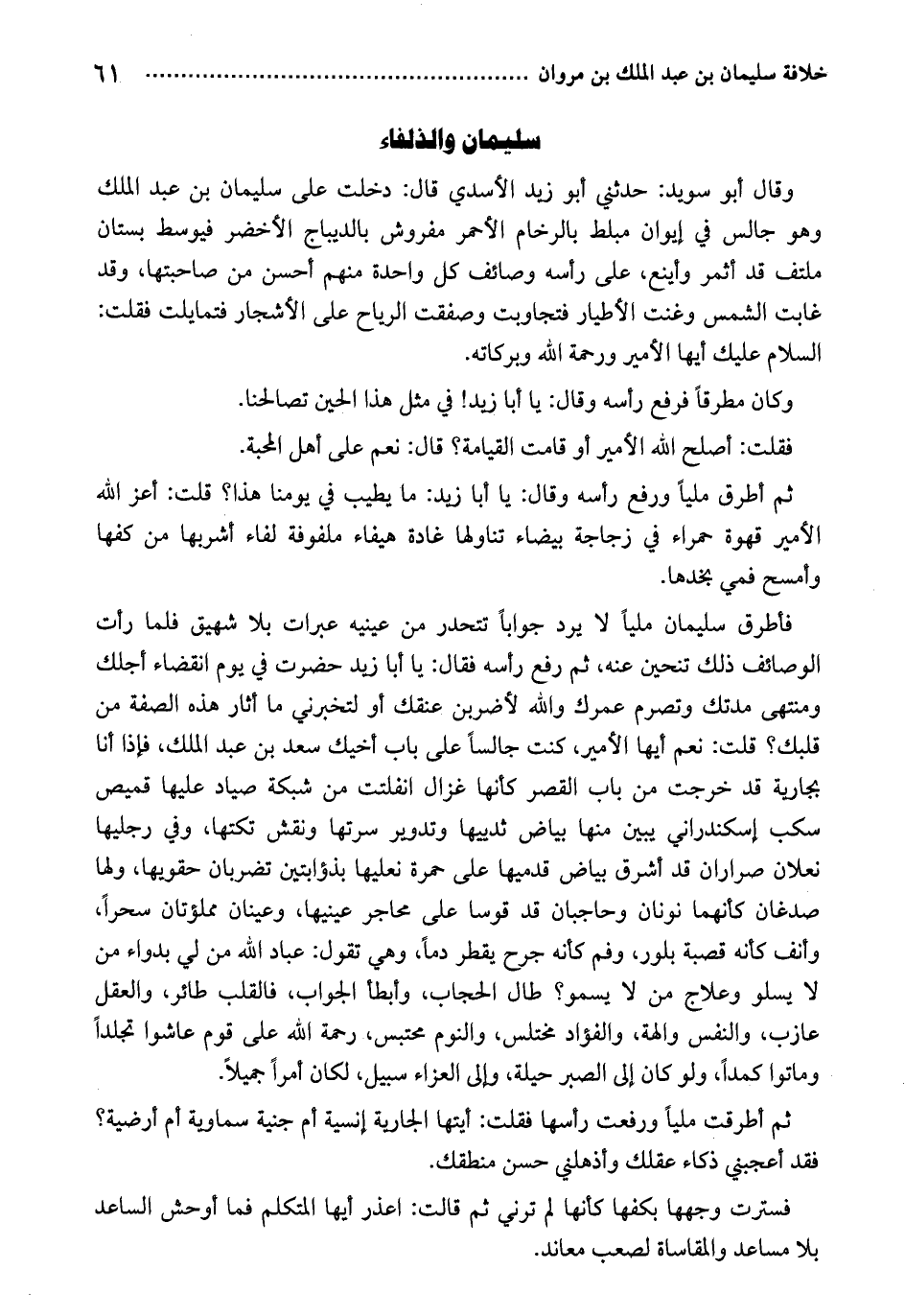فأطرق سليمان ملياً لا يرد جواباً تتحدر من عينيه عبرات بلا شهيق فلما رأت الوصائف ذلك تنحين عنه، ثم رفع رأسه فقال: يا أبا زيد حضرت في يوم انقضاء أجلك ومنتهى مدتك وتصرم عمرك والله لأضربن عنقك أو لتخبرني ما أثار هذه الصفة من قلبك؟ قلت: نعم أيها الأمير، كنت جالساً على باب أخيك سعد بن عبد الملك، فإذا أنا بجارية قد خرجت من باب القصر كأنها غزال انفلتت من شبكة صياد عليها قميص سكب إسكندراني يبين منها بياض ثدييها وتدوير سرتها ونقش تكتها، وفي رجليها نعلان صراران قد أشرق بياض قدميها على حمرة نعليها بذؤابتين تضربان حقويها، ولها صدغان كأنهما نونان وحاجبان قد قوسا على محاجر عينيها، وعينان مملؤتان سحراً، وأنف كأنه قصبة بلور، وفم كأنه جرح يقطر دماً، وهي تقول: عباد الله من لي بدواء من لا يسلو وعلاج من لا يسمو؟ طال الحجاب، وأبطأ الجواب، فالقلب طائر، والعقل عازب، والنفس والهة، والفؤاد مختلس، والنوم محتبس، رحمة الله على قوم عاشوا تجلداً وماتوا كمداً، ولو كان إلى الصبر حيلة، وإلى العزاء سبيل، لكان أمراً جميلاً.