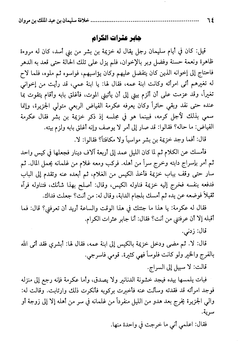 قيل: كان في أيام سليمان رجل يقال له خزيمة بن بشر من بني أسد، كان له مروءة ظاهرة ونعمة حسنة وفضل وبر بالإخوان، فلم يزل على تلك الحالة حتى قعد به الدهر فاحتاج إلى إخوانه الذين كان يتفضل عليهم وكان يؤاسيهم، فواسوه ثم ملوه، فلما لاح له تغيرهم أتى امرأته وكانت ابنة عمه، فقال لها: يا ابنة عمي، قد رأيت من إخواني تغيراً، وقد عزمت على أن ألزم بيتي إلى أن يأتيني الموت، فأغلق بابه وأقام يتقوت بما عنده حتى نفد وبقي حائراً وكان يعرفه عكرمة الفياض الربعي متولي الجزيرة، وإنما سمي بذلك لأجل كرمه، فبينما هو في مجلسه إذ ذكر خزيمة بن بشر فقال عكرمة الفياض: ما حاله؟ فقالوا: قد صار إلى أمر لا يوصف وإنه أغلق بابه ولزم بيته.