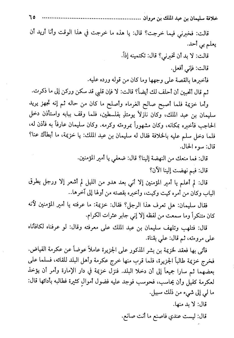 فقال سليمان: هل تعرف هذا الرجل؟ فقال: خزيمة: ما عرفته يا أمير المؤمنين لأنه كان متنكراً وما سمعت من لفظه إلا إني جابر عثرات الكرام.