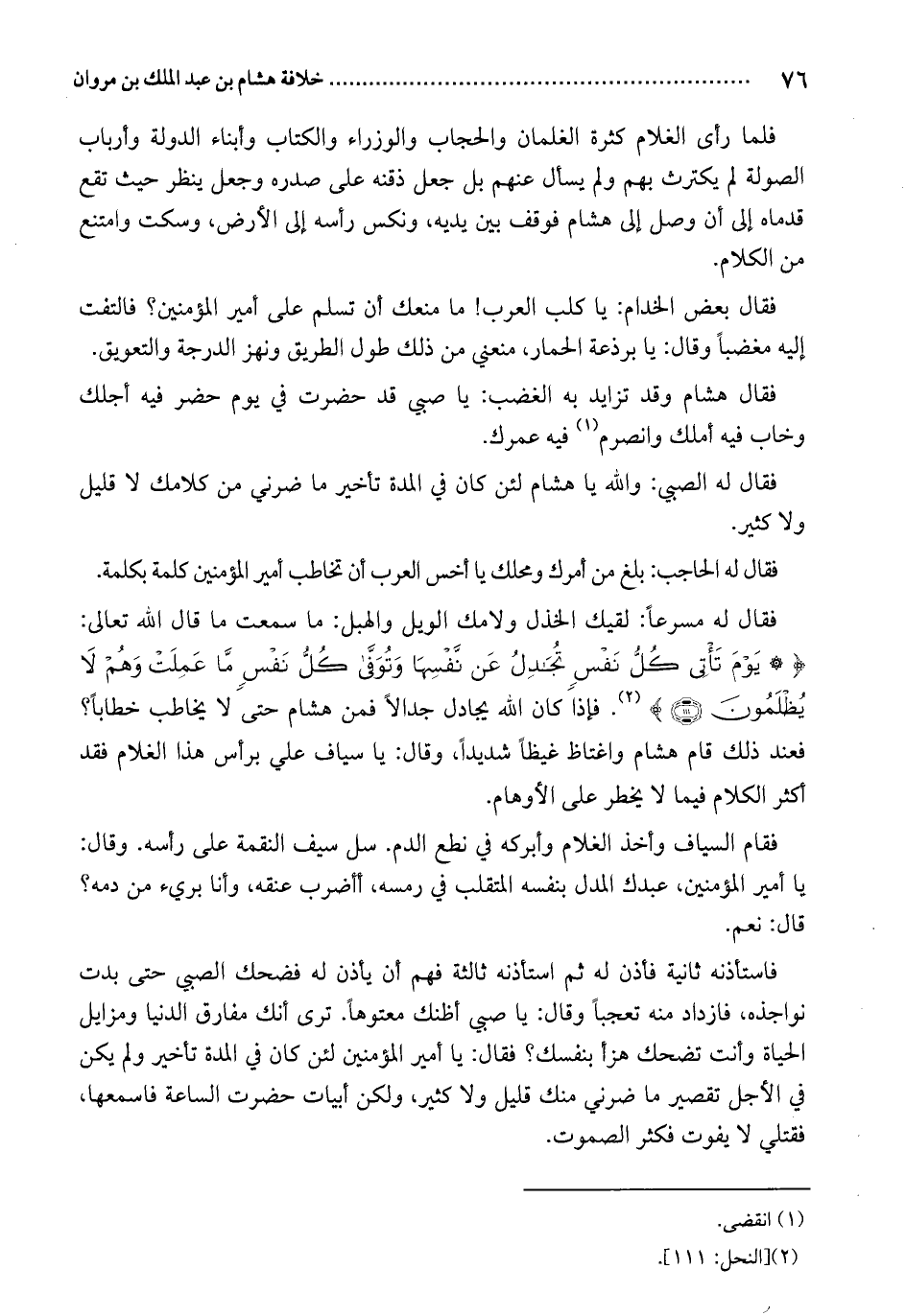 فلما رأى الغلام كثرة الغلمان والحجاب والوزراء والكتاب وأبناء الدولة وأرباب الصولة لم يكترث بهم ولم يسأل عنهم بل جعل ذقنه على صدره وجعل ينظر حيث تقع قدماه إلى أن وصل إلى هشام فوقف بين يديه، ونكس رأسه إلى الأرض، وسكت وامتنع من الكلام.