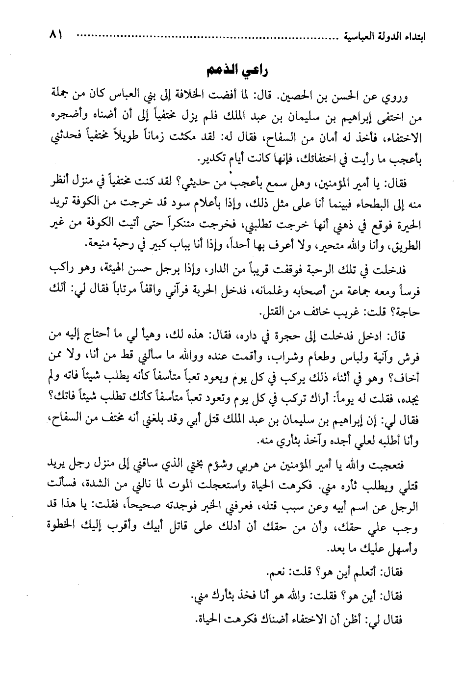 قال: ادخل قد خلت إلى حجرة في داره، فقال: هذه لك، وهيأ لي ما أحتاج إليه من فرش وآنية ولباس وطعام وشراب، وأقمت عنده ووالله ما سألني قط من أنا، ولا ممن أخاف؟ وهو في أثناء ذلك يركب في كل يوم ويعود تعباً متأسفاً كأنه يطلب شيئاً فاته ولم يجده، فقلت له يوماً: أراك تركب في كل يوم وتعون تعباً متأسفاً كأنك تطلب شيئاً فاتك؟ فقال لي: إن إبراهيم بن سليمان بن عبد الملك قتل أبي وقد بلغني أنه مختف من السفاح، وأنا أطلبه لعلي أجده وآخذ بثأري منه.