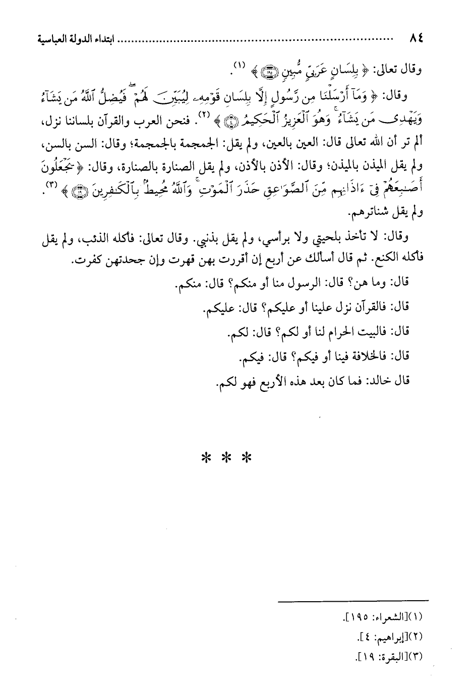 وقال تعالى: " بلسانٍ عربي مبين "، وقال: " وما أرسلنا من رسولٍ إلا بلسان قومهِ ". فنحن العرب والقرآن بلساننا نزل، ألم تر أن الله تعالى قال: العين بالعين، ولم يقل: الجمجمة بالجمجمة؛ وقال: السن بالسن، ولم يقل الميذن بالميذن؛ وقال: الأذن بالأذن، ولم يقل الصنارة بالصنارة، وقال: " يجعلون أصابعهم في آذانهم "، ولم يقل شناترهم. وقال: لا تأخذ بلحيتي ولا برأسي، ولم يقل بذنبي. وقال تعالى: فأكله الذئب، ولم يقل فأكله الكنع. ثم قال أسألك عن أربع إن أقررت بهن قهرت وإن جحدتهن كفرت.