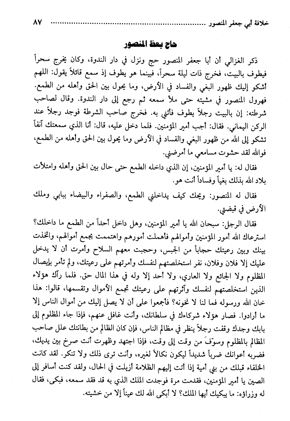 فقال له المنصور: ويحك كيف يداخلني الطمع، والصفراء والبيضاء ببابي وملك الأرض في قبضتي.