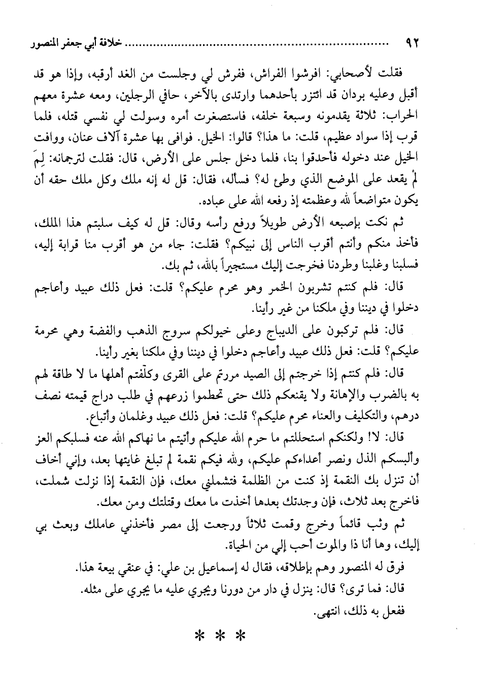 ثم نكت بإصبعه الأرض طويلاً ورفع رأسه وقال: قل له كيف سلبتم هذا الملك، فأخذ منكم وأنتم أقرب الناس إلى نبيكم؟ فقلت: جاء من هو أقرب منا قرابة إليه، فسلبنا وغلبنا وطردنا فخرجت إليك مستجيراً بالله، ثم بك.
