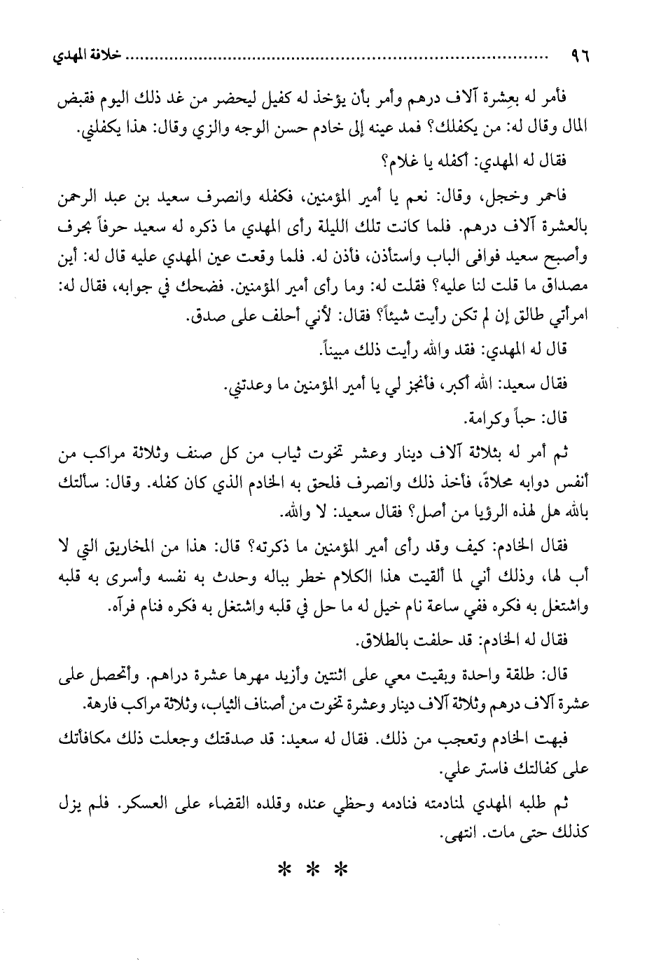 فاحمر وخجل، وقال: نعم يا أمير المؤمنين، فكفله وانصرف سعيد بن عبد الرحمن بالعشرة آلاف درهم. فلما كانت تلك الليلة رأى المهدي ما ذكره له سعيد حرفاً بحرف وأصبح سعيد فوافى الباب واستأذن، فأذن له. فلما وقعت عين المهدي عليه قال له: أين مصداق ما قلت لنا عليه؟ فقلت له: وما رأى أمير المؤمنين. فضحك في جوابه، فقال له: امرأتي طالق إن لم تكن رأيت شيئاً؟ فقال: لأني أحلف على صدق.