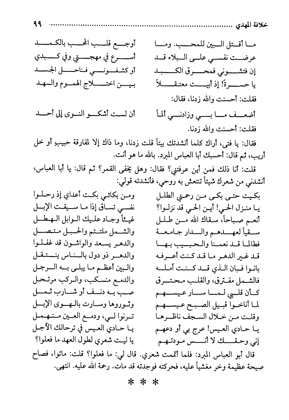 فقال: يا فتى، أراك كلما أنشدتك بيتاً قلت زدنا، وما ذاك إلا لمفارقة حبيبٍ أو خل أريب، ثم قال: أحسبك أبا العباس المبرد. بالله ما هو أنت.