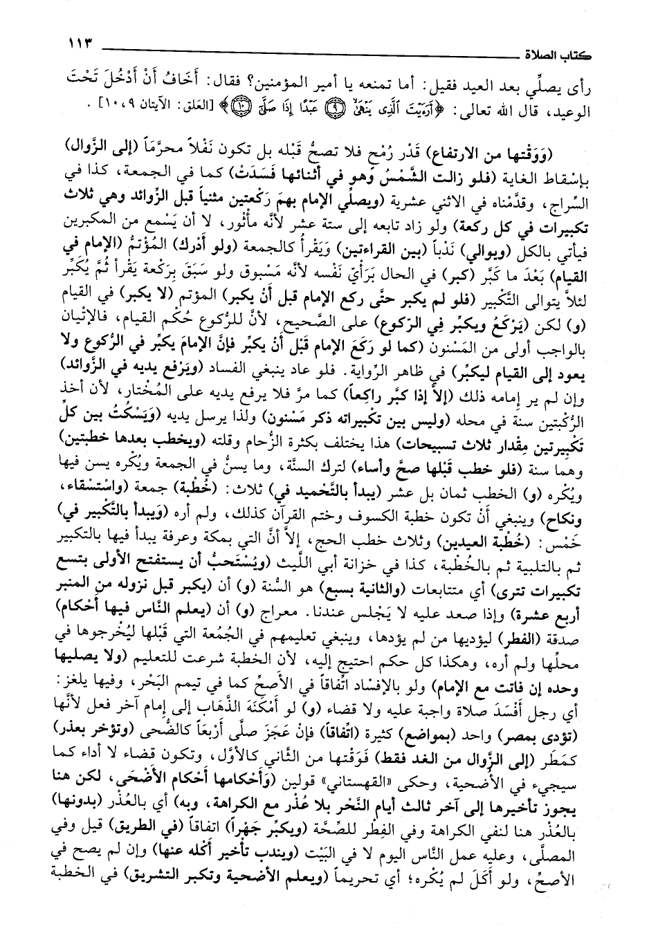 رأى يصلي بعد العيد فقيل: أما تمنعه يا أمير المؤمنين؟ فقال: أخاف أن أدخل تحت الوعيد، قال الله تعالى: * (أرأيت الذي ينهى عبدا إذا صلى) * (ووقتها من