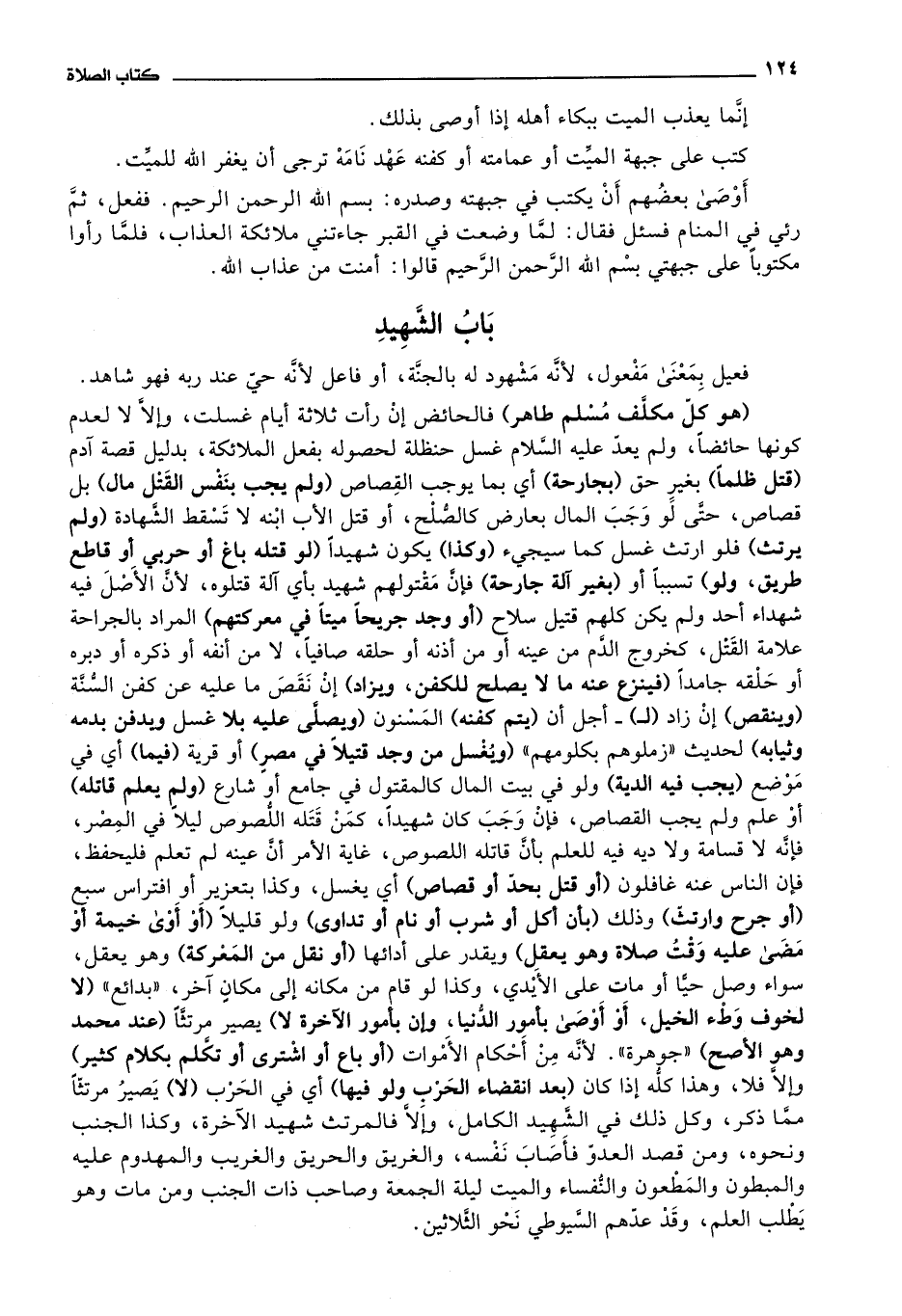 جوهرة. لانه من أحكام الاموات (أو باع أو اشترى أو تكلم بكلام كثير) وإلا فلا، وهذا كله إذا كان (بعد انقضاء الحرب ولو فيها) أي في الحرب (لا) يصير مرتثا مما ذكر، وكل ذلك في الشهيد الكامل، وإلا فالمرتث شهيد الآخرة، وكذا الجنب ونحوه، ومن قصد العدو فأصاب نفسه، والغريق والحريق والغريب والمهدوم عليه والمبطون والمطعون والنفساء والميت ليلة الجمعة وصاحب ذات الجنب ومن مات وهو يطلب العلم، وقد عدهم السيوطي نحو الثلاثين.