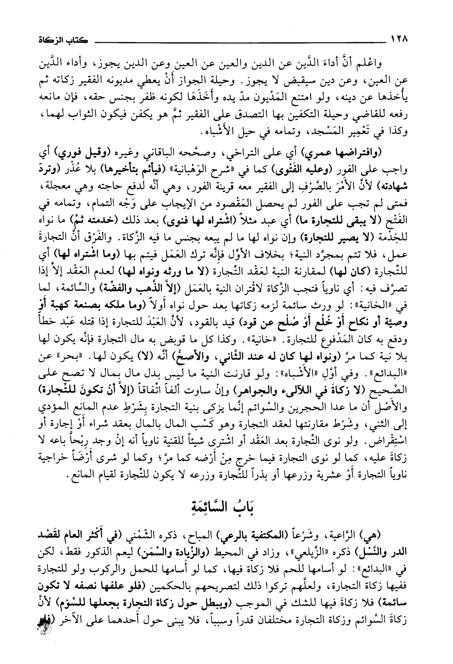 باب السائمة (هي) الراعية، وشرعا (المكتفية بالرعي) المباح، ذكره الشمني (في أكثر العام لقصد الدر والنسل) ذكره الزيلعي، وزاد في المحيط (والزيادة والسمن) ليعم الذكور فقط، لكن في
