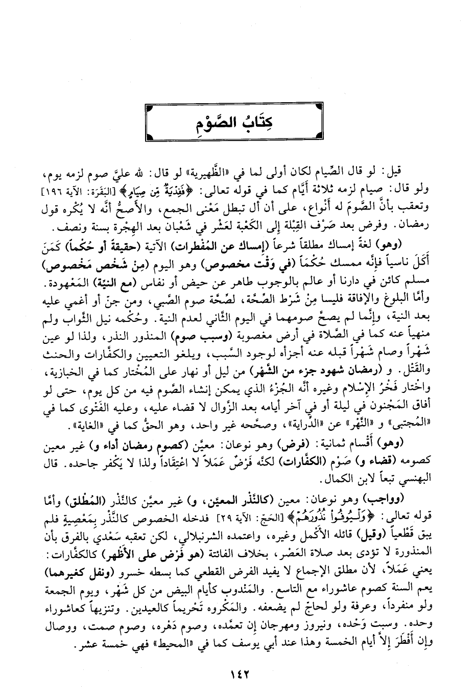(وهو) أقسام ثمانية: (فرض) وهو نوعان: معين (كصوم رمضان أداء و) غير معين كصومه (قضاء و) صوم (الكفارات) لكنه فرض عملا لا اعتقادا ولذا لا يكفر جاحده.