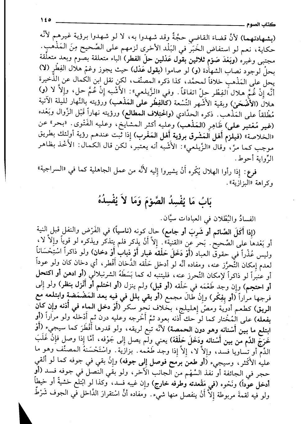 وفي الزيلعي: الاشبه إن عم حل، وإلا لا (و) هلال (الاضحى) وبقية الاشهر التسعة (كالفطر على المدهب) ورؤيته بالنهار لليلة الآتية مطلقا على المذهب.