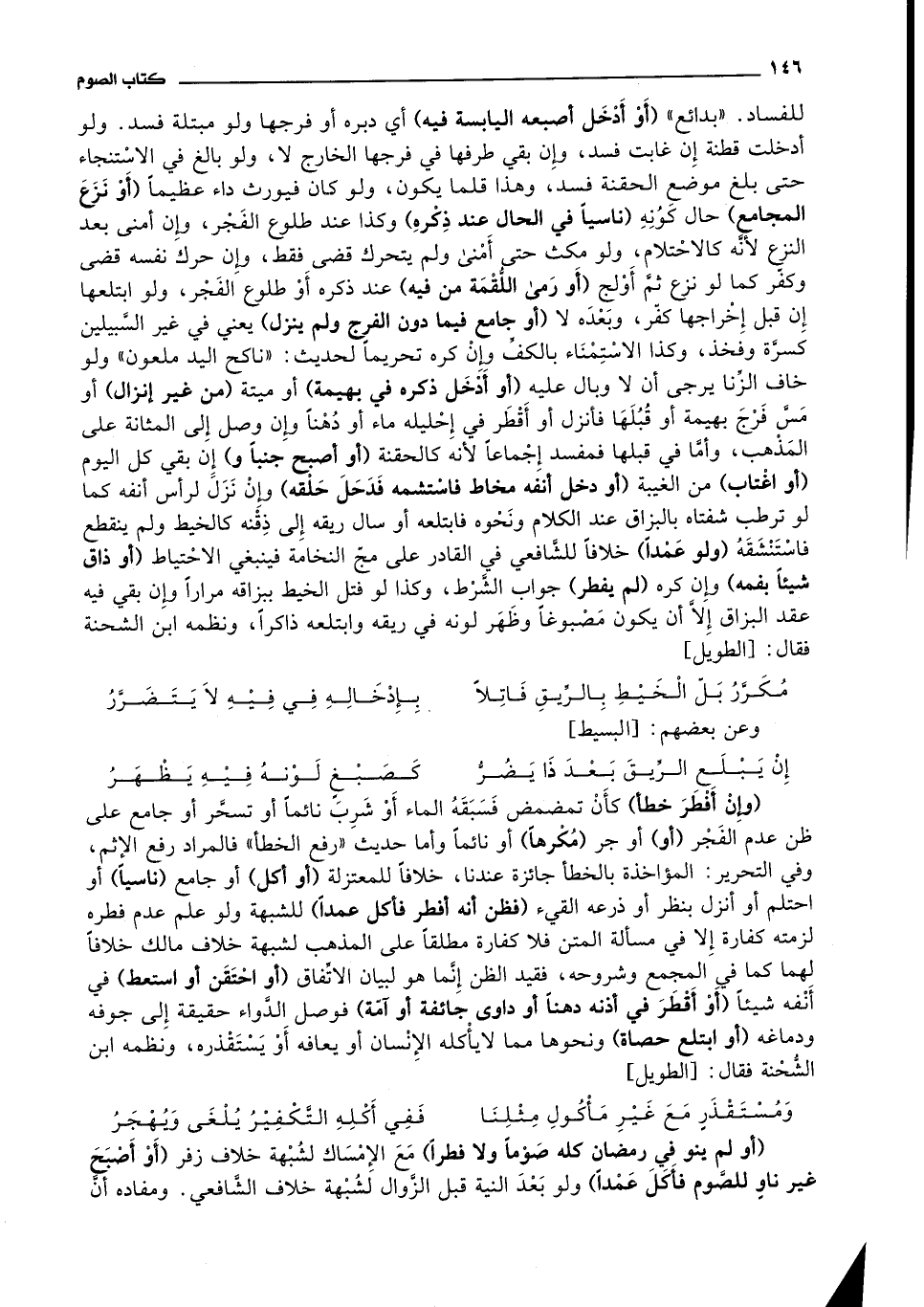 حتى بلغ موضع الحقنة فسد، وهذا قلما يكون، ولو كان فيورث داء عظيما (أو نزع المجامع) حال كونه (ناسيا في الحال عند ذكره) وكذا عند طلوع الفجر، وإن أمنى بعد النزع لانه كالاحتلام، ولو مكث حتى أمنى ولم يتحرك قضى فقط، وإن حرك نفسه قضى وكفر كما لو نزع ثم أولج (أو رمى اللقمة من فيه) عند ذكره أو طلوع الفجر، ولو ابتلعها إن قبل إخراجها