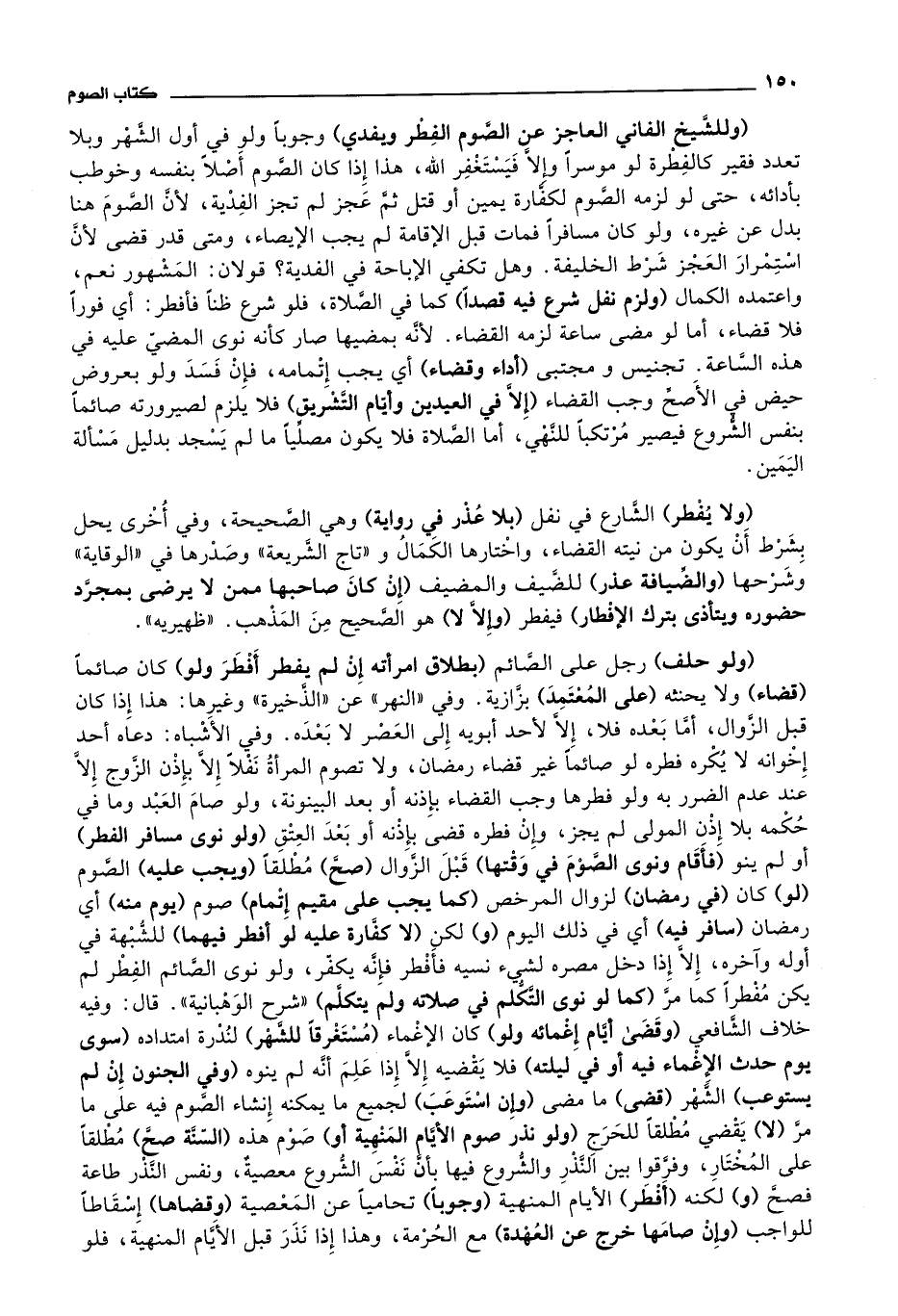 وهل تكفي الاباحة في الفدية؟ قولان: المشهور نعم، واعتمده الكمال (ولزم نفل شرع فيه قصدا) كما في الصلاة، فلو شرع ظنا فأفطر: أي فورا فلا قضاء، أما لو مضى ساعة لزمه القضاء. لانه بمضيها صار كأنه نوى المضي عليه في هذه الساعة. تجنيس ومجتبى (أداء وقضاء) أي يجب إتمامه، فإن فسد ولو بعروض حيض في الاصح وجب القضاء (إلا في العيدين وأيام التشريق) فلا يلزم لصيرورته صائما بنفس الشروع فيصير مرتكبا للنهي، أما بالصلاة فلا يكون مصليا ما لم يسجد بدليل مسألة اليمين (ولا يفطر) الشارع في نفل (بلا عذر في رواية) وهي الصحيحة، وفي أخرى يحل بشرط أن يكون من نيته القضاء،