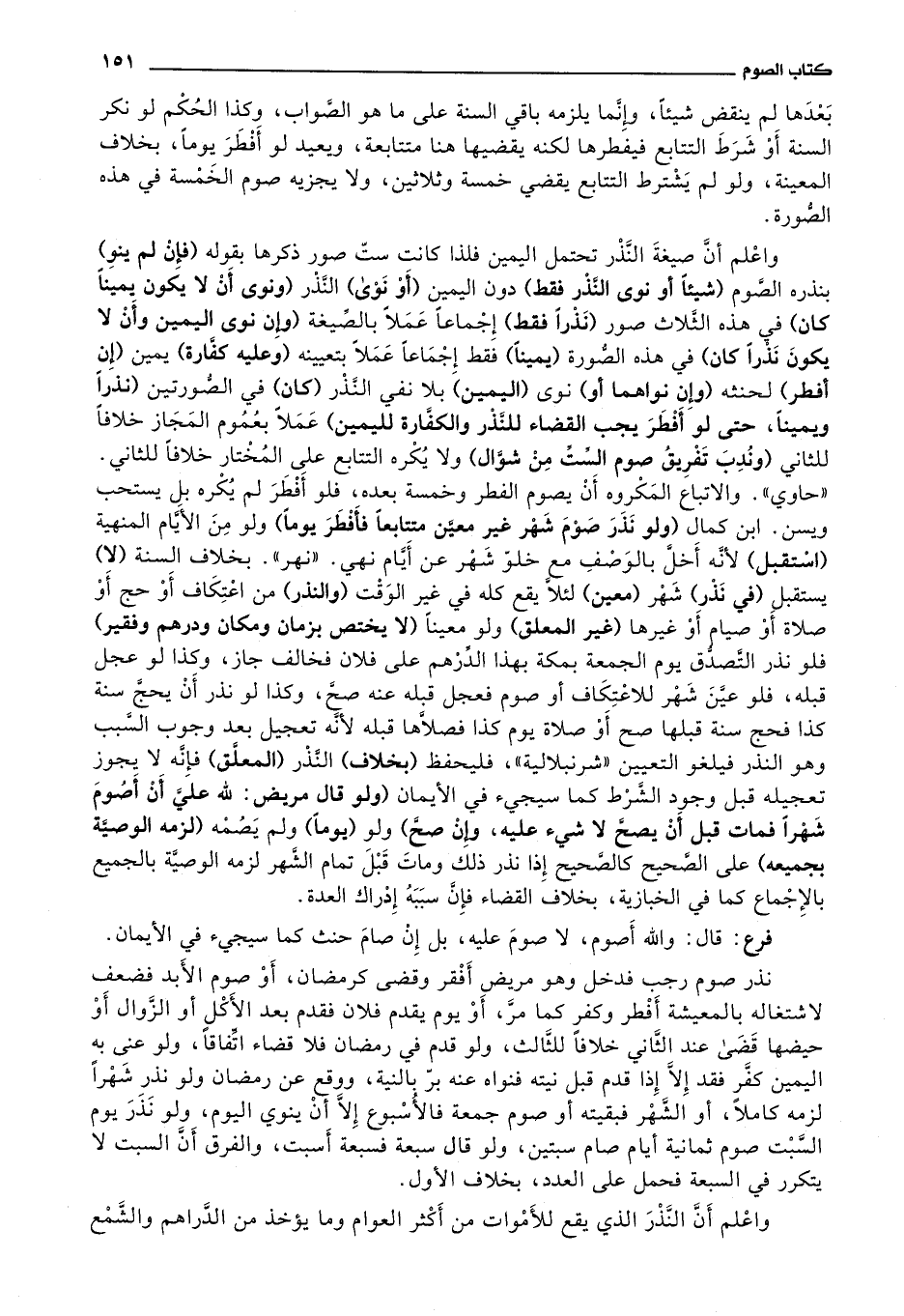 بعدها لم ينقض شيئا، وإنما يلزمه باقي السنة على ما هو الصواب، وكذا الحكم لو نكر السنة أو شرط التتابع فيفطرها لكنه يقضيها هنا متتابعة، ويعيد لو أفطر يوما، بخلاف المعينة، ولو لم يشترط التتابع يقضي خمسة وثلاثين، ولا يجزيه صوم الخمسة في هذه الصورة. واعلم أن صيغة النذر تحتمل اليمين فلذا كانت ست صور ذكرها بقوله (فإن لم ينو) بنذره الصوم (شيئا أو نوى النذر فقط) دون اليمين (أو نوى) النذر (ونوى أن لا يكون يمينا كان) في هذه الثلاث صور (نذرا فقط) إجماعا عملا بالصيغة (وإن نوى اليمين وأن لا يكون نذرا كان) في هذه الصورة (يمينا) فقط إجماعا عملا بتعيينه (وعليه كفارة) يمين (إن أفطر) لحنثه (وإن نواهما أو) نوى (اليمين) بلا نفي النذر (كان) في الصورتين (نذرا ويمينا، حتى لو أفطر يجب القضاء للنذر والكفارة لليمين) عملا بعموم المجاز خلافا للثاني (وندب تفريق صوم الست من شوال) ولا يكره التتابع على المختار خلافا للثاني.