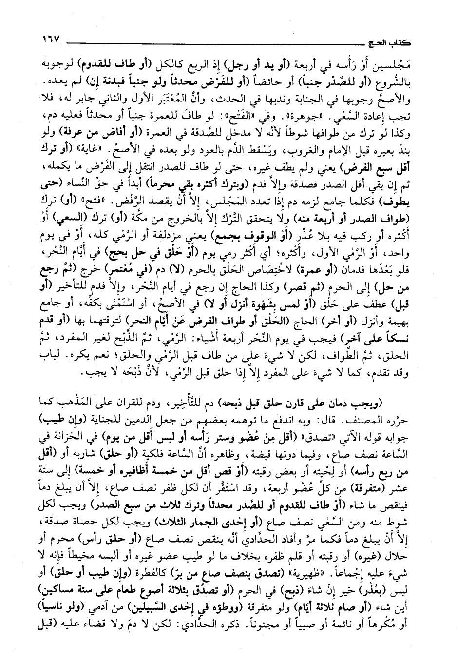الآتي تصدق (أقل من عضو وستر رأسه أو لبس أقل من يوم) في الخزانة في الساعة نصف صاع، وفيما دونها قبضة، وظاهره أن الساعة فلكية (أو حلق) شاربه أو (أقل من ربع رأسه) أو لحيته أو بعض رقبته (أو قص أقل من خمسة أظافيره أو خمسة) إلى ستة عشر (متفرقة) من كل عضو أربعة، وقد استقر أن لكل ظفر نصف صاع، إلا أن يبلغ دما فينقص ما شاء (أو طاف للقدوم أو للصدر محدثا وترك ثلاث من سبع الصدر) ويجب لكل شوط منه ومن السعي نصف صاع (أو إحدى الجمار الثلاث) ويجب لكل حصاة صدقة، إلا أن يبلغ دما فكما مر وأفاد الحدادي أنه ينقص نصف صاع
