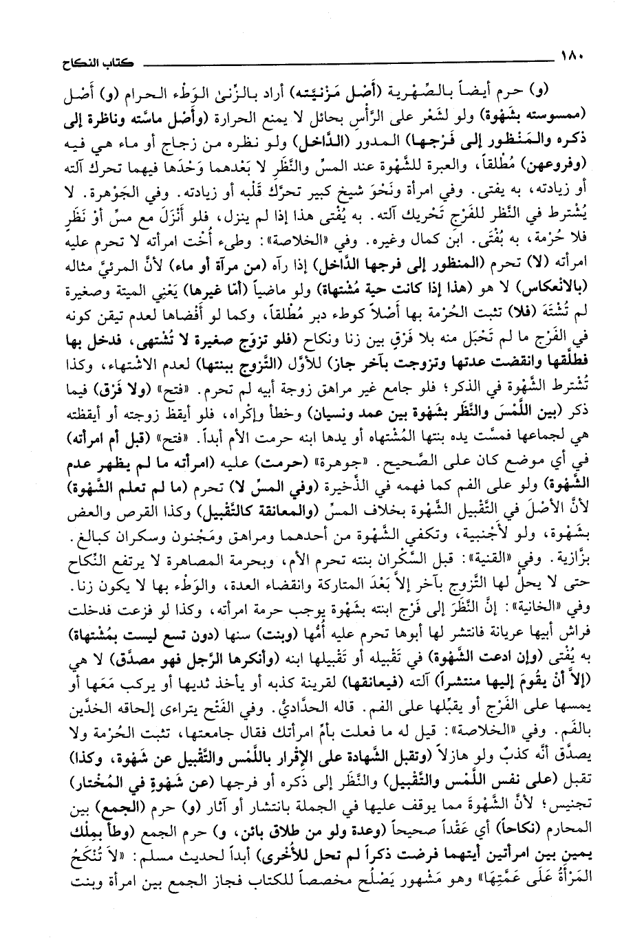 (و) حرم أيضا بالصهرية (أصل مزنيته) أراد بالزنى الوطئ الحرام (و) أصل (ممسوسته بشهوة) ولو لشعر على الرأس بحائل لا يمنع الحرارة (وأصل ماسته وناظرة إلى ذكره والمنظور إلى فرجها) المدور (الداخل) ولو نظره من زجاج أو ماء هي فيه (وفروعهن) مطلقا، والعبرة للشهوة عند المس والنظر لا بعدهما وحدها فيهما تحرك آلته أو زيادته، به يفتى. وفي امرأة ونحو شيخ كبير تحرك قلبه أو زيادته. وفي الجوهرة. لا يشترط في النظر للفرج تحريك آلته. به يفتى هذا إذا لم ينزل، فلو أنزل مع مس أو نظر فلا حرمة، به بفتى.