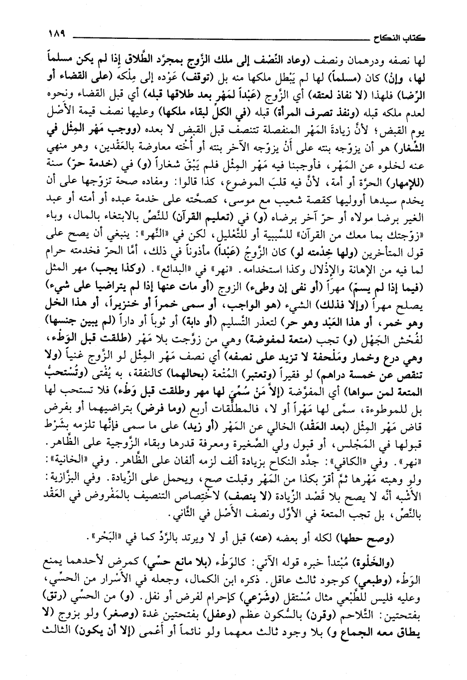 لها نصفه ودرهمان ونصف (وعاد النصف إلى ملك الزوج بمجرد الطلاق إذا لم يكن مسلما لها، وإن) كان (مسلما) لها لم يبطل ملكها منه بل (توقف) عوده إلى ملكه (على القضاء أو الرضا) فلهذا (لا نفاذ لعتقه) أي الزوج (عبدا لمهر بعد طلاقها قبله) أي قبل القضاء ونحوه لعدم ملكه قبله (ونفذ تصرف المرأة) قبله (في الكل لبقاء ملكها) وعليها نصف قيمة الاصل يوم القبض، لان زيادة المهر المنفصلة تتنصف قبل القبض لا بعده (ووجب مهر المثل في الشغار) هو أن يزوجه بنته على أن يزوجه الآخر بنته أو أخته معاوضة بالعقدين، وهو منهي عنه لخلوه عن المهر، فأوجبنا فيه مهر المثل فلم يبق شغارا (و) في (خدمة حر) سنة (للامهار) الحرة أو أمة، لان فيه قلب الموضوع، كذا قالوا: ومفاده صحة تزوجها على أن يخدم سيدها أو وليها كقصة شعيب مع موسى، كصحته على خدمة عبده أو أمته أو عبد الغير برضا مولاه أو حر آخر برضاه (و) في (تعليم القرآن) للنص بالابتغاء بالمال، وباء زوجتك بما معك من القرآن للسببية أو للتعليل، لكن في النهر: ينبغي أن يصح على قول المتأخرين