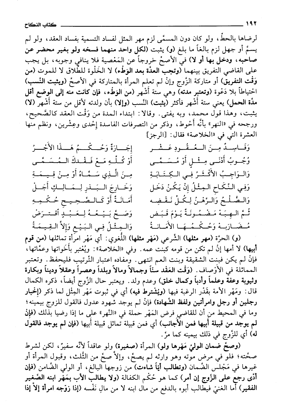 وجوب أدنى مثل أو مسمى أو كله مع فقدك المسمى والواجب الاكثر في الكتابة من الذي سماه أو من قيمه وفي النكاح المثل إن يكن دخل وخارج البذر لمالك أجل والصلح والرهن لكل نقضه أمامة أو كالصحيح حكمه ثم الهبة مضمونة يوم قبض وصح بيعه لعبد اقترض مضاربه وحكمها الامانه والمهثل في البيع وإلا القيمه