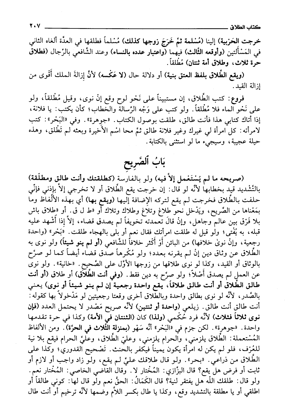باب الصريح (صريحه ما لم يستعمل إلا فيه) ولو بالفارسة (كطلقتك وأنت طالق ومطلقة) بالتشديد قيد بخطابها لانه لو قال: إن خرجت يقع الطلاق أو لا تخرجي إلا بإذني فإني حلفت بالطلاق فخرجت لم يقع لتركه الاضافة إليها (ويقع بها) أي بهذه الالفاظ