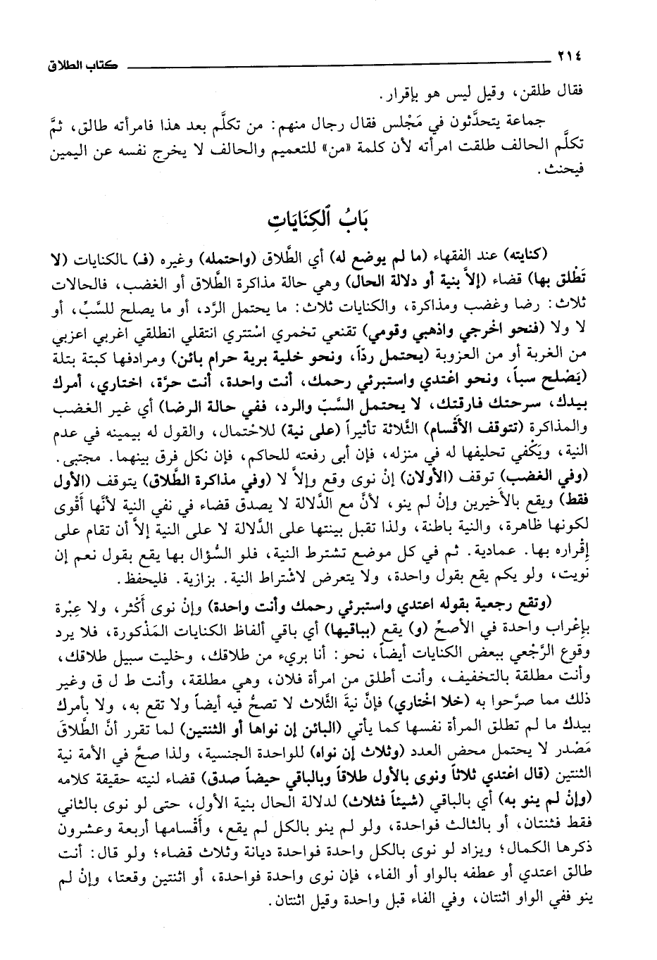 قضاء (إلا بنية أو دلالة الحال) وهي حالة مذاكرة الطلاق أو الغضب، فالحالات ثلاث: رضا وغضب ومذاكرة، والكنايات ثلاث: ما يحتمل الرد، أو ما يصلح للسب، أو لا ولا