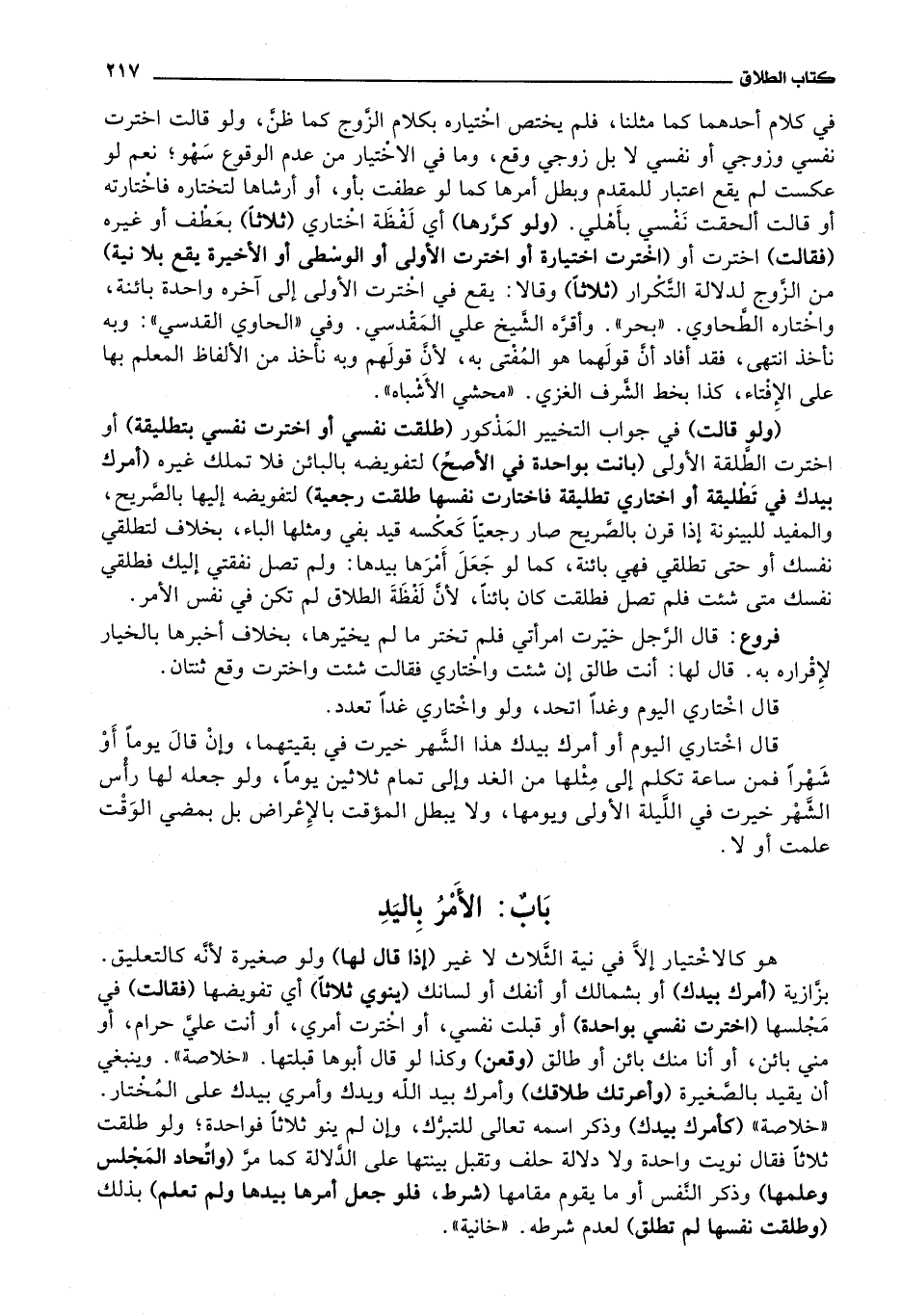 خلاصة (كأمرك بيدك) وذكر اسمه تعالى للتبرك، وإن لم ينو ثلاثا فواحدة، ولو طلقت ثلاثا فقال نويت واحدة ولا دلالة حلف وتقبل بينتها على الدلالة كما مر (واتحاد المجلس وعلمها) وذكر النفس أو ما يقوم مقامها (شرط، فلو جعل أمرها بيدها ولم تعلم) بذلك (وطلقت نفسها لم تطلق) لعدم شرطه.