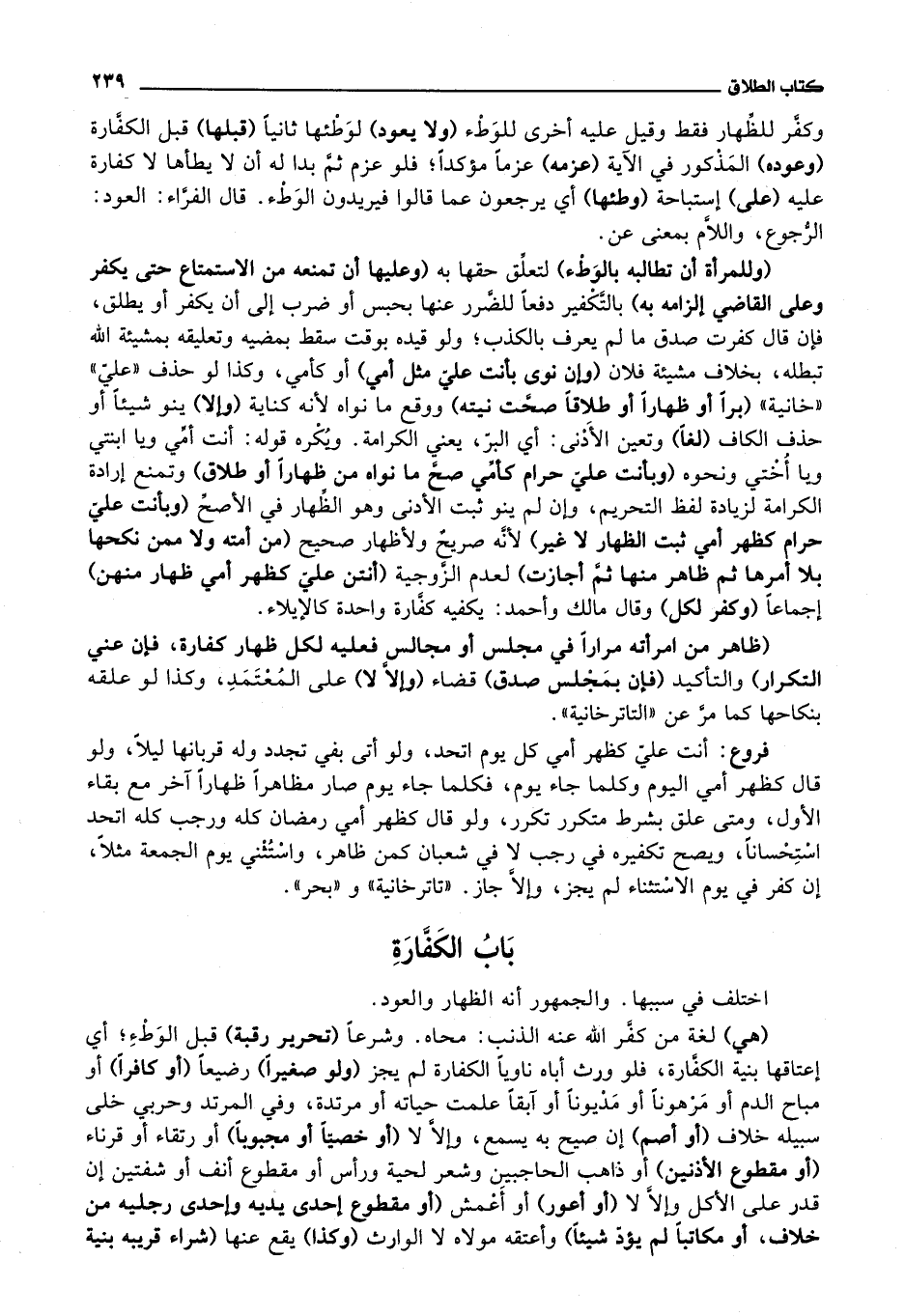 (وللمرأة أن تطالبه بالوطئ) لتعلق حقها به (وعليها أن تمنعه من الاستمتاع حتى يكفر وعلى القاضي إلزامه به) بالتكفير دفعا للضرر عنها بحبس أو ضرب إلى أن يكفر أو يطلق، فإن قال كفرت صدق ما لم يعرف بالكذب، ولو قيده بوقت سقط بمضيه وتعليقه بمشيئة الله تبطله، بخلاف مشيئة فلان (وإن نوى بأنت علي مثل أمي) أو كأمي، وكذا لو حذف علي خانية (برا أو ظهارا أو طلاقا صحت نيته) ووقع ما نواه لانه كناية (وإلا) ينو شيئا أو حذف الكاف (لغا) وتعين الادنى: أي البر، يعني الكرامة.