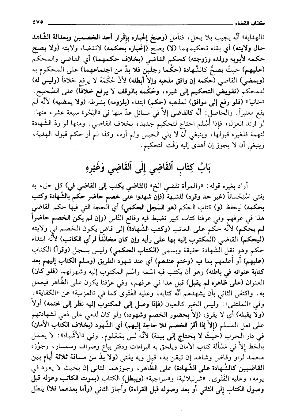 باب كتاب القاضي إلى القاضي وغيره أراد بغيره قوله: والمرأة تقضي الخ (القاضي يكتب إلى القاضي في) كل حق، به يفتى استحسانا (غير حد وقود) للشبهة (فإن شهدوا على خصم حاضر حكم بالشهادة وكتب بحكمه)