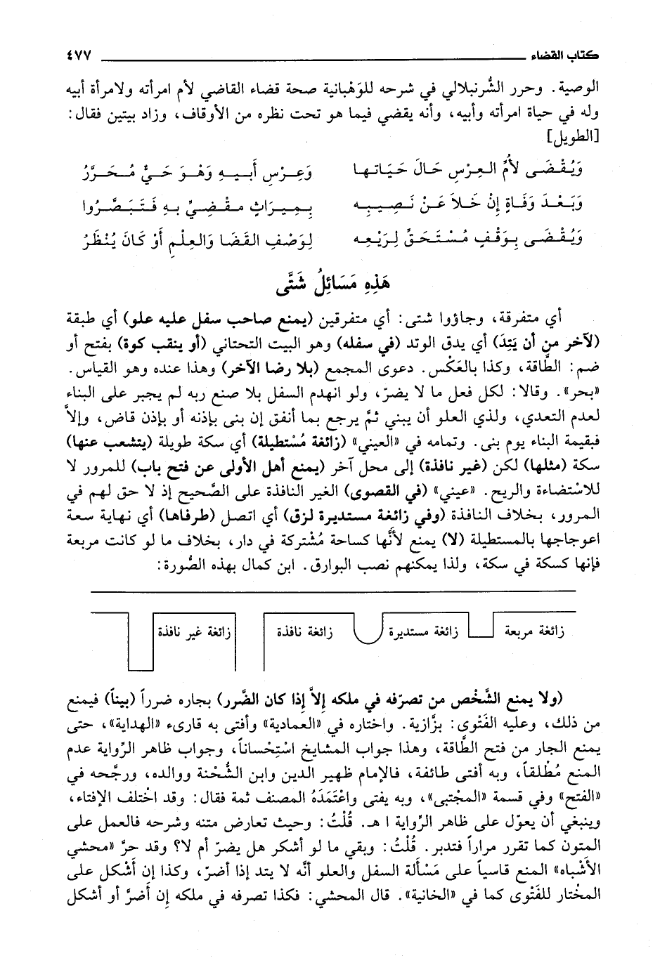 وبعد وفاة إن خلا عن نصيبه بميراث مقضي به فتبصروا ويقضى بوقف مستحق لريعه لوصف القضا والعلم أو كان ينظر هذه مسائل شتى أي متفرقة، وجاؤوا شتى: أي متفرقين (يمنع صاحب سفل عليه علو) أي طبقة (لآخر من أن يتد) أي يدق الوتد (في سفله) وهو البيت التحتاني (أو ينقب كوة) بفتح أو ضم الطاقة، وكذا بالعكس.