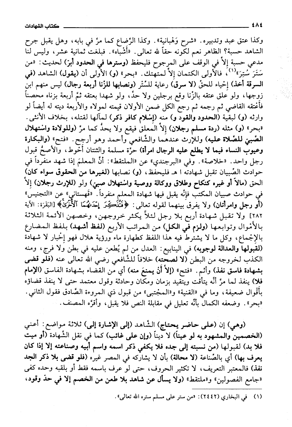قهستاني عن التجنيس (أو رجل وامرأتان) ولا يفرق بينهما لقوله تعالى: * (فتذكر إحداهما الاخرى) * ولا تقبل شهادة أربع بلا رجل لئلا يكثر خروجهن، وخصهن الائمة الثلاثة بالاموال وتوابعها (ولزم في الكل) من المراتب الاربع (لفظ أشهد) بلفظ المضارع بالاجماع، وكل ما لا يشترط فيه هذا اللفظ كطهارة ماء ورؤية هلال فهو إخبار لا شهادة (لقبولها والعدالة لوجوبه) في الينابيع: العدل من لم يطعن عليه في بطن ولا فرج، ومنه الكذب لخروجه من البطن