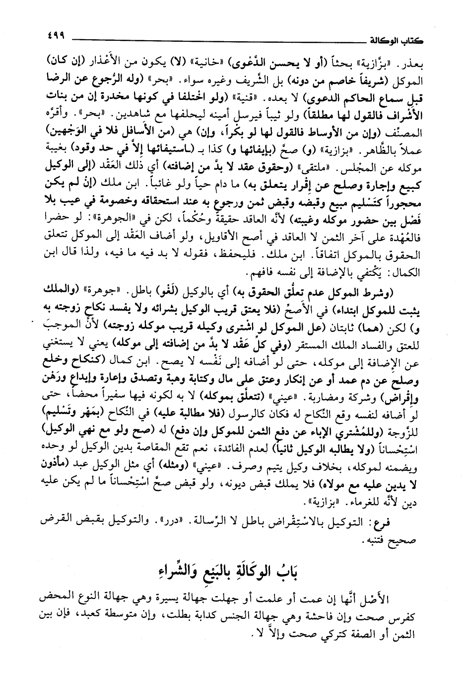 باب الوكالة بالبيع والشراء الاصل أنها إن عمت أو علمت أو جهلت جهالة يسيرة وهي جهالة النوع المحض كفرس صحت وإن فاحشة وهي جهالة الجنس كدابة بطلت، وإن متوسطة كعبد، فإن بين الثمن أو الصفة كتركي صحت وإلا لا.