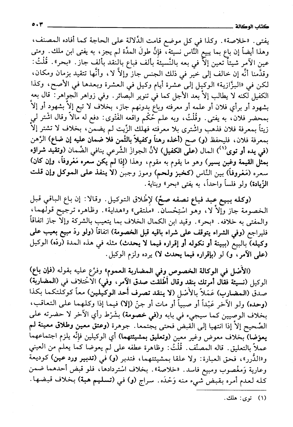 وفي زواهر الجواهر: قال بعه بشهود أو برأي فلان أو علمه أو معرفته وباع بدونهم جاز، بخلاف لا تبع إلا بشهود أو إلا بمحضر فلان، به يفتى.