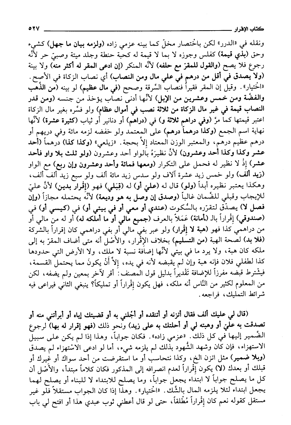 يؤخذ من جنسه (ومن قدر النصاب قيمة في غير مال الزكاة من ثلاثة نصب في أموال عظام) ولو فسره بغير مال الزكاة اعتبر قيمتها كما مر (وفي دراهم ثلاثة و) في (دراهم) أو دنانير أو ثياب (كثيرة عشرة) لانها نهاية اسم الجمع (وكذا درهما درهم) على المعتمد ولو خفضه لزمه مائة وفي دريهم أو درهم عظيم درهم، والمعتبر الوزن المعتاد إلا بحجة.