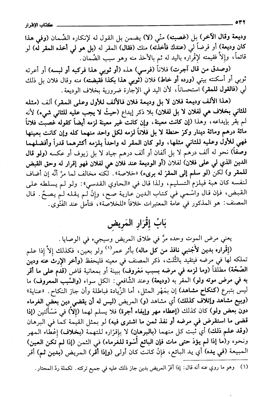 بالثلث، ذكر المصنف في معينه فليحفظ (وأخر الارث عنه ودين الصحة) مطلقا (وما لزمه في مرضه بسبب معروف) ببينة أو بمعانية قاض (قدم على ما أقر به في مرض موته ولو) المقر به (وديعة) وعند الشافعي: الكل سواء (والسبب المعروف) ما ليس بتبرع (كنكاح مشاهد) إن بمهر المثل، أما الزيادة فباطلة وأن جاز النكاح.