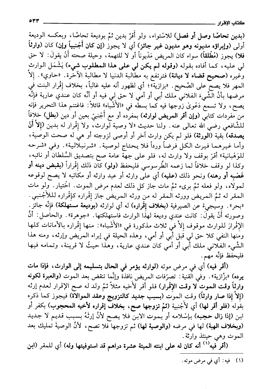 زوجها فيه كما بسطه في الاشباه قائلا: فاعتنم هذا التحرير فإنه من مفردات كتابي (وإن أقر المريض لوارثه) بمفرده أو مع أجنبي بعين أو دين (بطل) خلافا للشافعي رضي الله تعالى عنه.