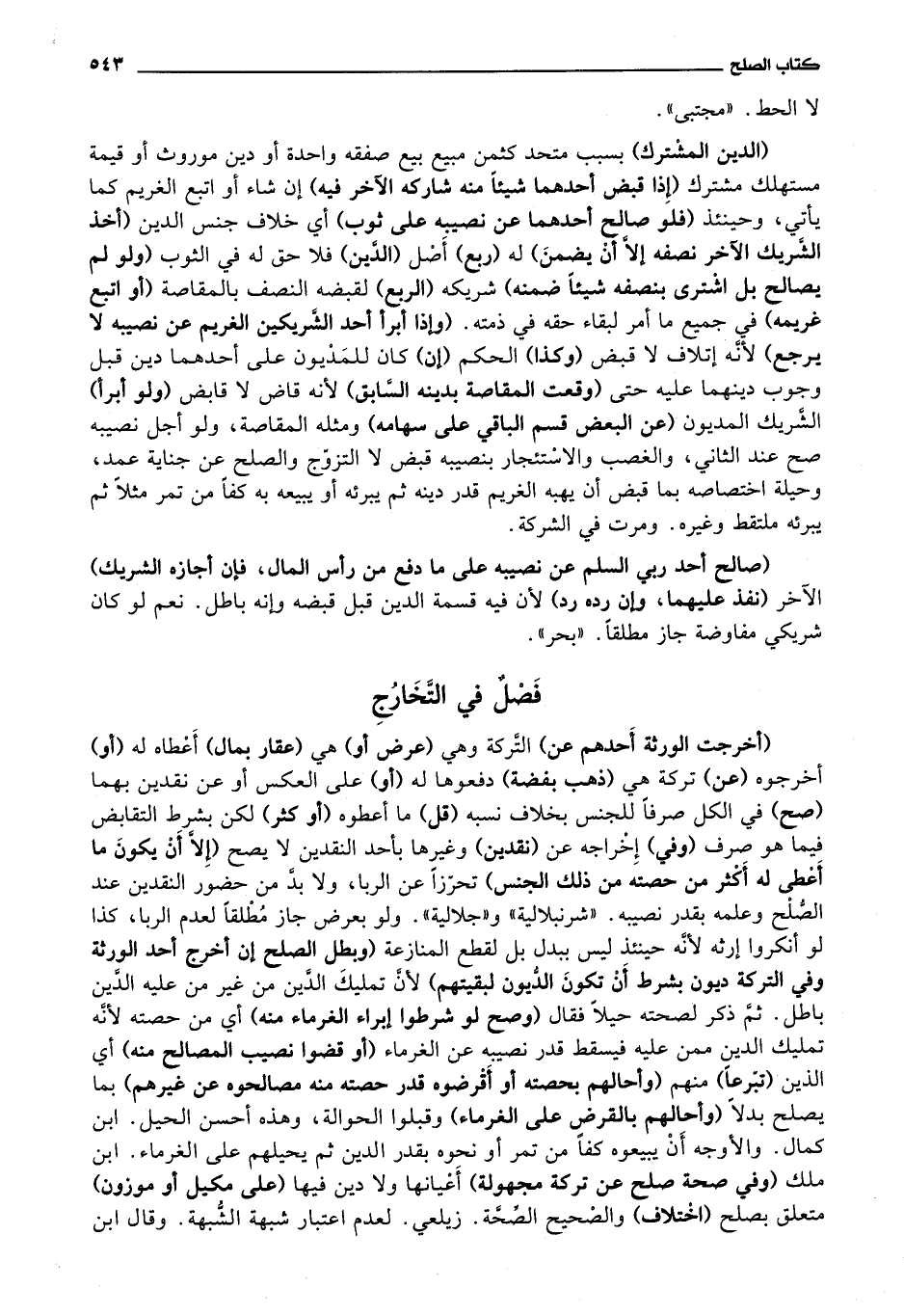 فصل في التخارج (أخرجت الورثة أحدهم عن) التركة وهي (عرض أو) هي (عقار بمال) أعطاه له (أو) أخرجوه (عن) تركة هي (ذهب بفضة) دفعوها له (أو) على العكس أو عن نقدين بهما (صح) في الكل صرفا للجنس بخلاف نسبه (قل) ما أعطوه (أو كثر) لكن بشرط التقابض فيما هو صرف (وفي) إخراجه عن (نقدين) وغيرها بأحد النقدين لا يصح (إلا أن يكون ما أعطى له أكثر من حصته من ذلك الجنس) تحرزا عن الربا، ولا بد من حضور النقدين عند الصلح وعلمه بقدر نصيبه.