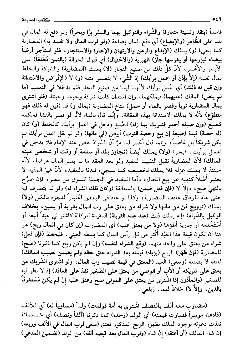 عن بيع الحال، وأما المفيد في الجملة كسوق من مصر، فإن صرح بالنهي صح، وإلا لا (فإن فعل ضمن) بالمخالفة (وكان ذلك الشراء له) ولو لم يتصرف فيه حتى عاد للوفاق عادت المضاربة، وكذا لو عاد في البعض اعتبارا للجزء بالكل (ولا) يملك (تزويج قن من مالها ولا شراء من يعتق على رب المال بقرابة أو يمين، بخلاف الوكيل بالشراء) فإنه يملك ذلك (عند عدم القرينة) المقيدة للوكالة كاشتر لي عبدا أبيعه أو أستخدمه أو جارية أطؤها (ولا من يعتق عليه) أي المضارب (إن كان في المال ربح) هو هنا أن تكون قيمة هذا العبد أكثر من كل رأس المال كما بسطه العيني.