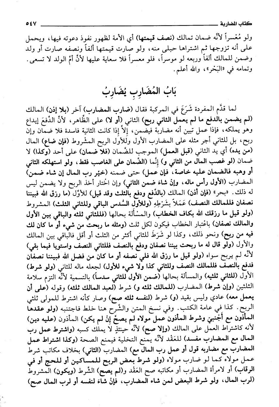 وفي نسخ المتن والشرح هنا خلط فاجتنبه (ولو عقدها المأذون مع أجنبي وشرط المأذون عمل مولاه لم يصح إن لم يكن) المأذون (عليه دين) لانه كاشتراط العمل على المالك (وإلا صح) لانه حينئذ لا يملك كسبه (واشترط عمل رب المال مع المضارب مفسد) للعقد لانه يمنع التخلية فيمنع الصحة (وكذا اشتراط عمل المضارب مع مضاربه قول أو عمل رب المال مع) المضارب (الثاني) بخلاف مكاتب شرط عمل مولاه كما لو ضارب مولاه (ولو شرط بعض الربح للمساكين أو للحج أو في الرقاب) أو لامرأة المضارب أو مكاتبه صح العقد و (لم يصح) الشرط (ويكون) المشروط (لرب المال، ولو شرط البعض لمن شاء المضارب، فإن شاء لنفسه أو لرب المال صح)