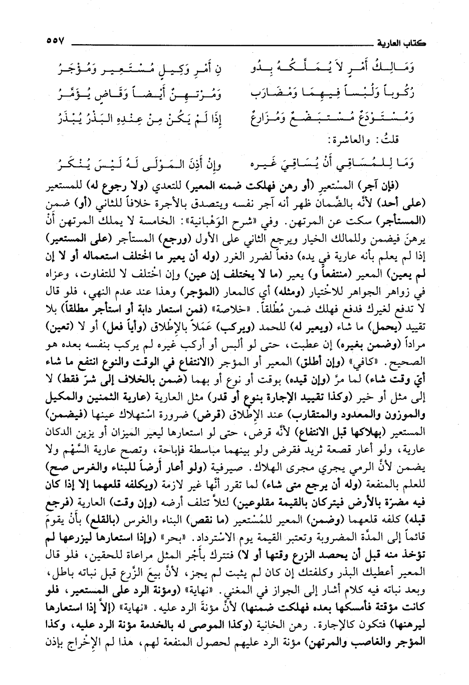 ركوبا ولبسا فيهما ومضارب * * ومرتهن أيضا وقاض يؤمر ومستودع مستبضع ومزارع * * إذا لم يكن من عنده البذر يبذر قلت: والعاشرة: وما للمساقي أن يساقي غيره وإن أذن المولى له ليس ينكر (فإن آجر) المستعير (أو رهن فهلكت ضمنه المعير) للتعدي (ولا رجوع له) للمستعير (على أحد) لانه بالضمان ظهر أنه آجر نفسه ويتصدق بالاجرة خلافا للثاني (أو) ضمن (المستأجر) سكت عن المرتهن.