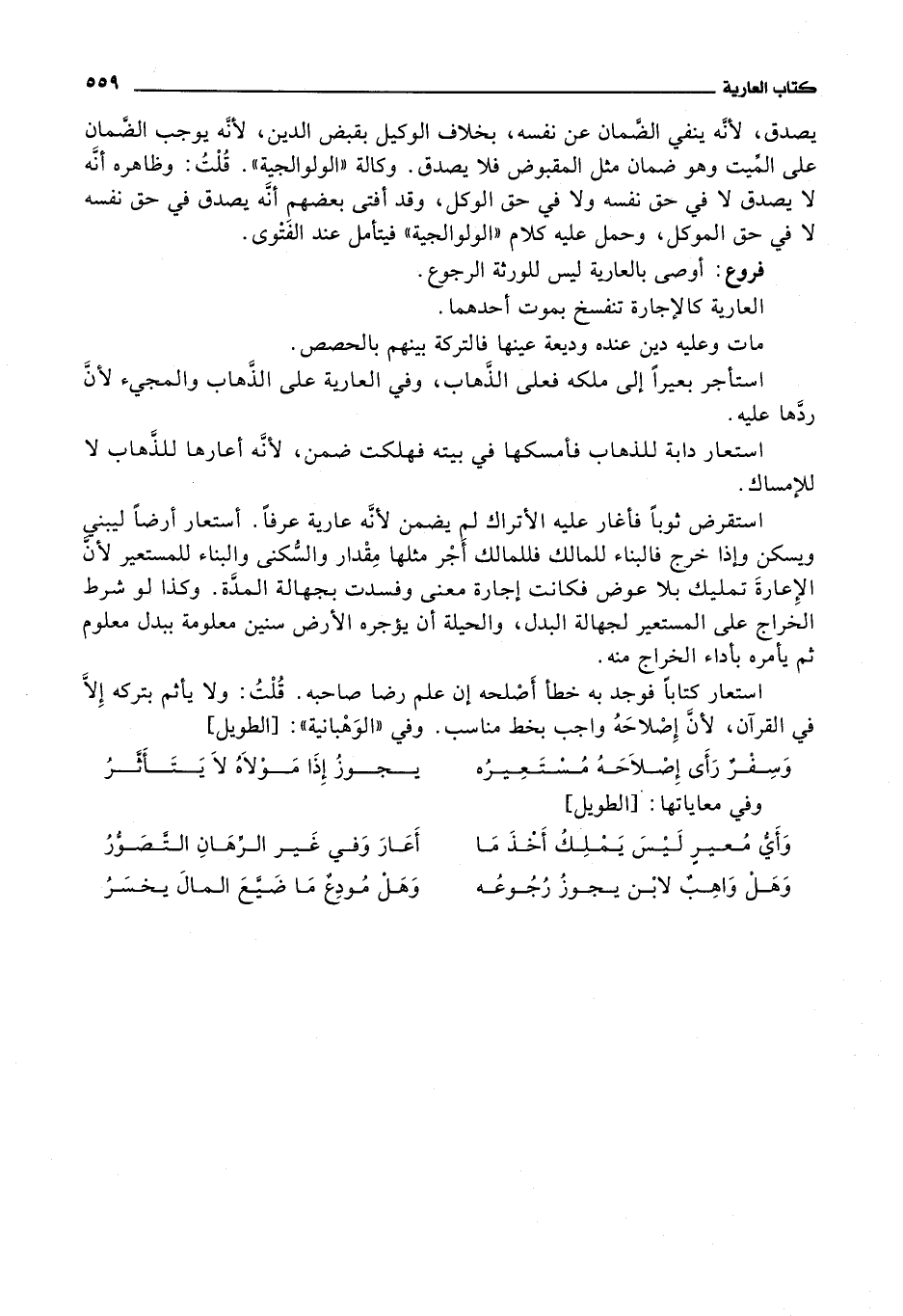 وفي الوهبانية: وفي معاياتها: وسفر رأى إصلاحه مستعيره * * يجوز إذا مولاه لا يتأثر وأي معير ليس يملك أخذ ما * * أعاروفي غير الرهان التصور وهل واهب لابن يجوز رجوعه * * وهل مودع ما ضيع المال يخسر